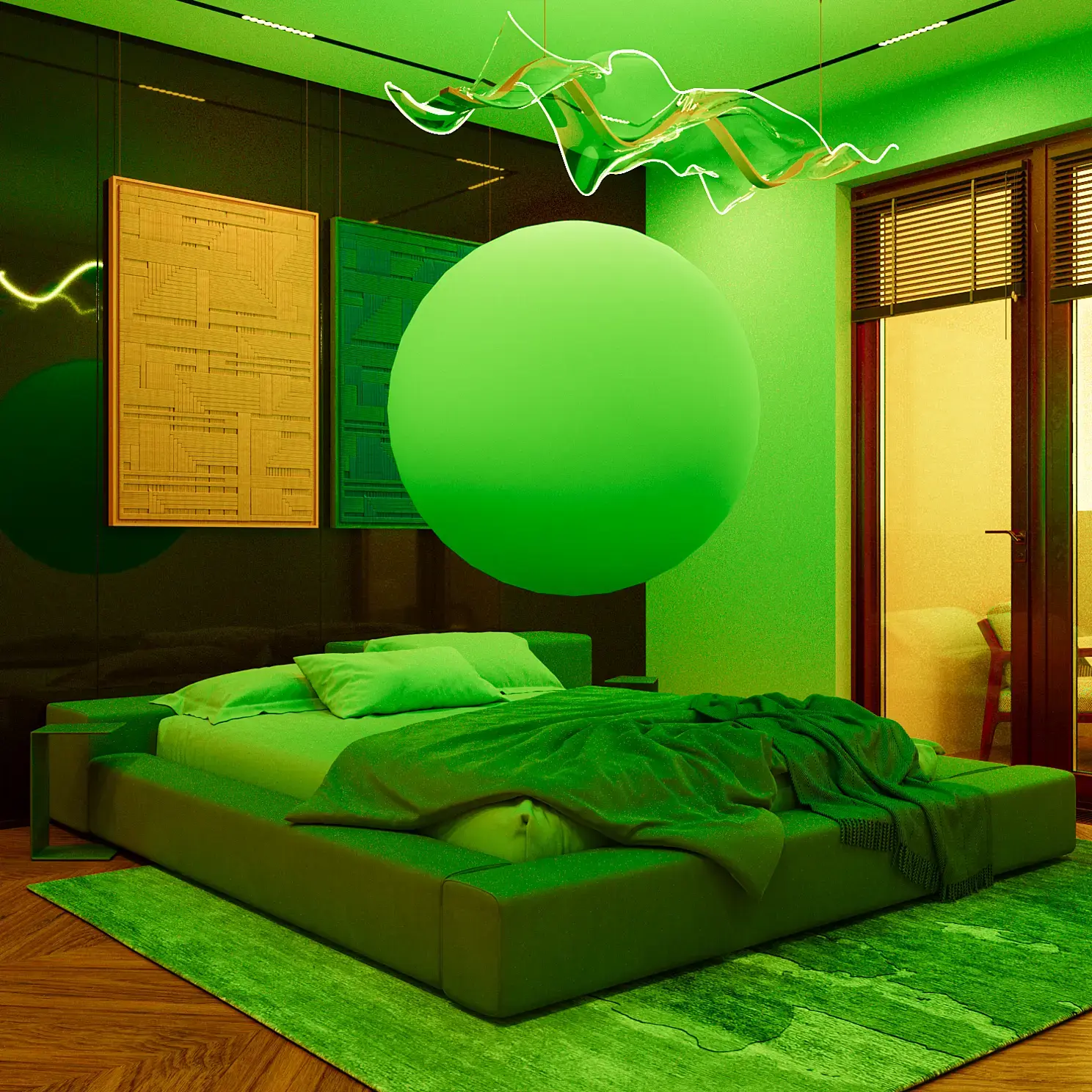 Причем, обратите внимание, что то, как блуждают цвета по картинке (помещению), в первую очередь зависит от светопереноса. Вот что будет если этот шар оставить таким же по насыщенности зеленого, но убрать яркость. Именно она, в первую очередь, влияет на то, как цвет будет мигрировать в стороны от объекта/поверхности: