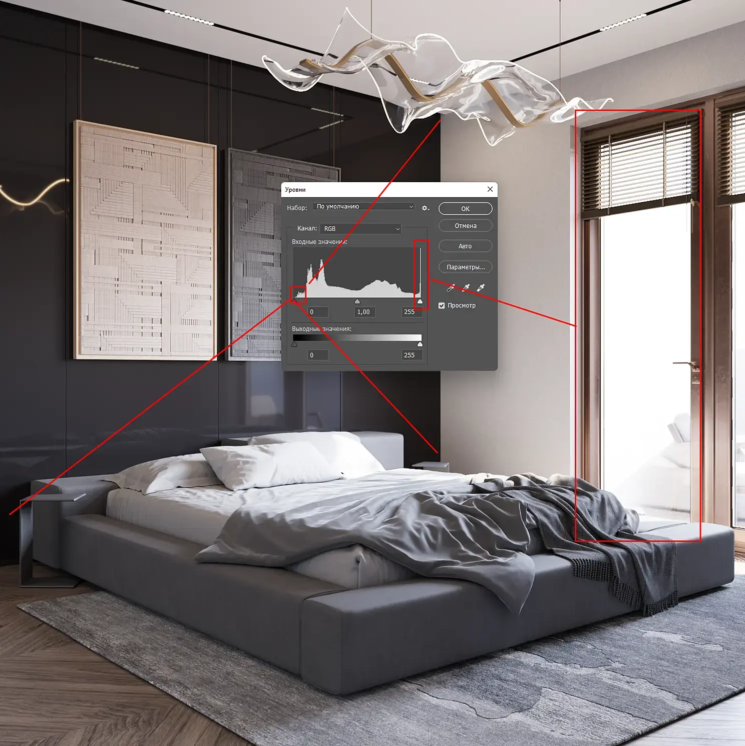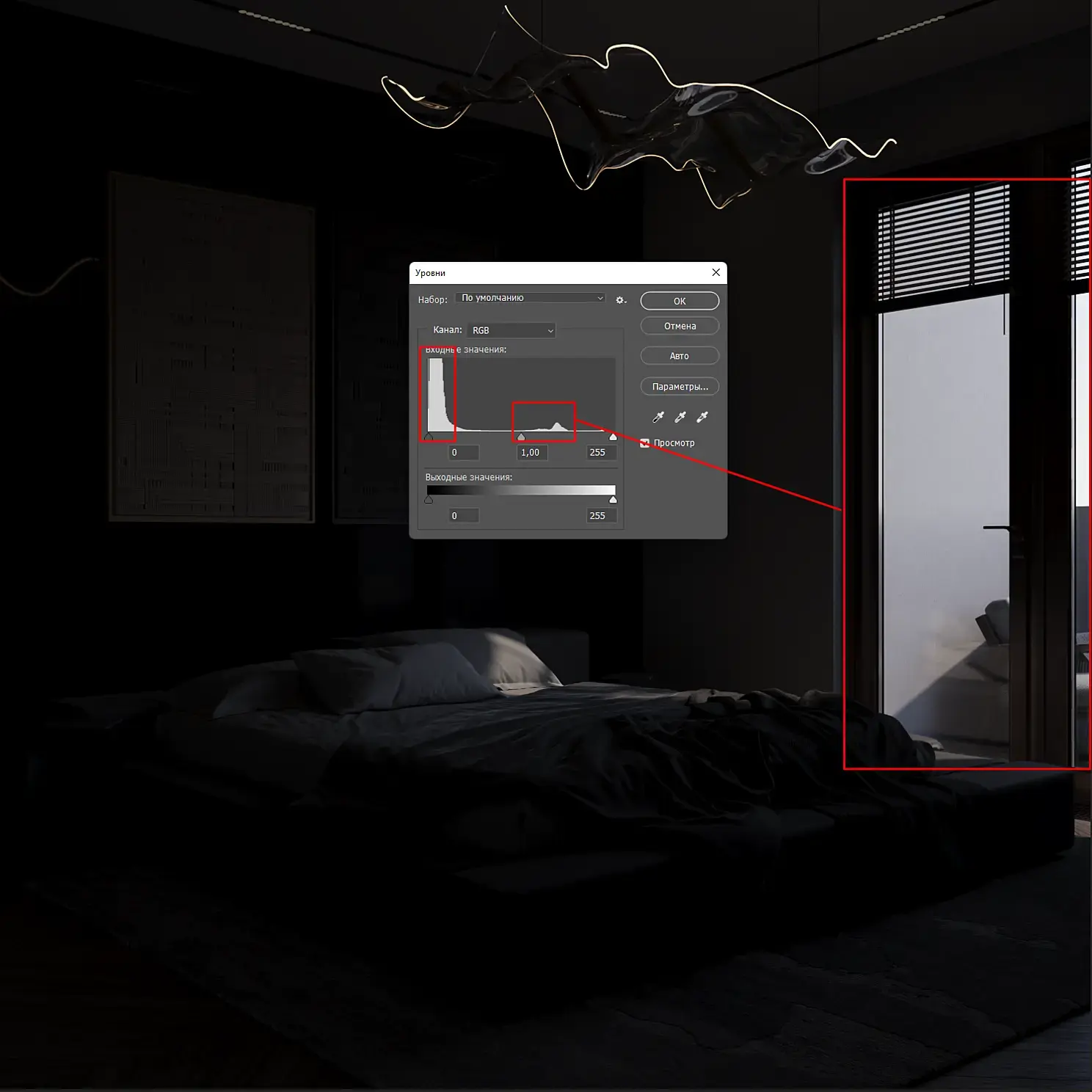 Мы четко видим где клипует наша область балкона в светлом, видим наши близкие к черному тени по углам, остальные материалы и поверхности, разложены достаточно ровно по гистограмме, с акцентом на темную область из за левой стены (она темная в базе), и правой стены и потолка (они светлые), остальное болтается посередине, но нам есть чем показывать эту информацию с точки зрения яркости.
