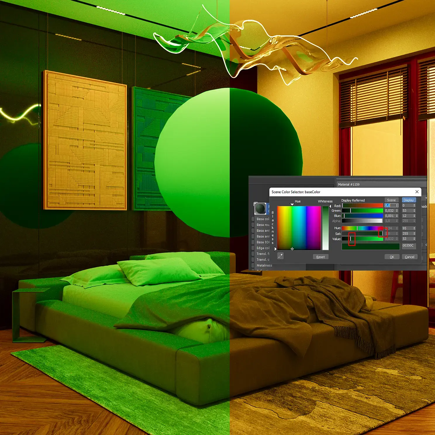 И повторим - это то, что несут сами свойства поверхностей. Свет дает только яркость поверхностям.Важно. От помещения к помещению параметры поверхностей свои. И иногда один предмет может сильно "увести" итоговый оттенок комнаты в сторону.