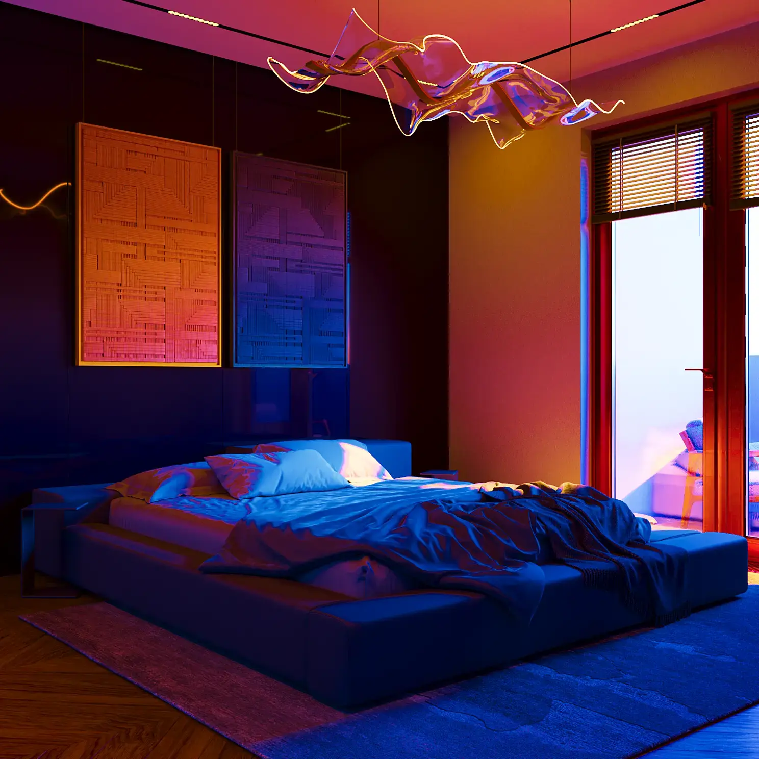 В таком случае, на итоговой визуализации достаточно мест, где материал комнаты освещен холодным, теплым, и смешанным светом. Так же, по яркости (экспозиции) кадра, в нем есть и места глубоких теней, и достаточно сильно засвеченные участки, что позволяет полнее раскрыть материал.