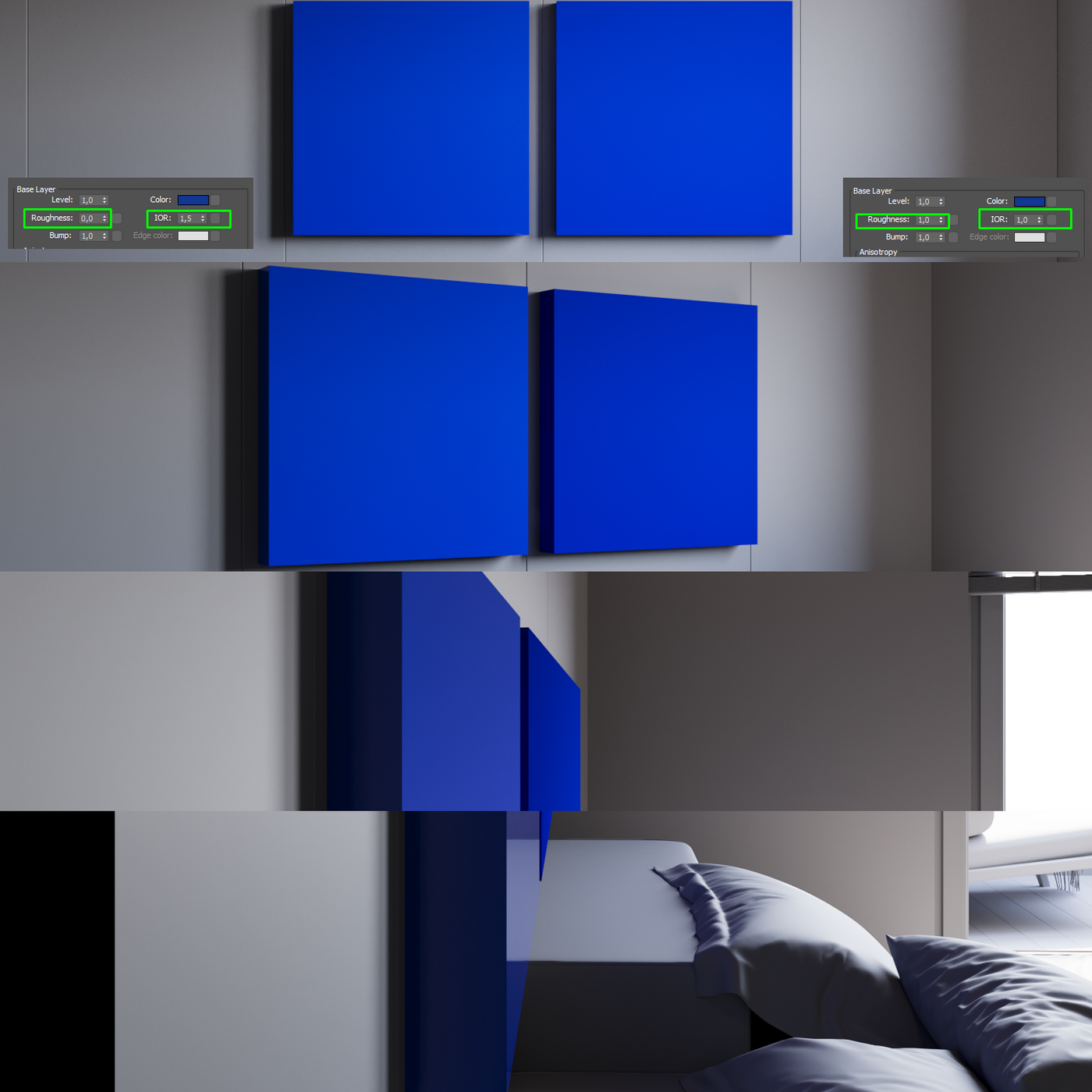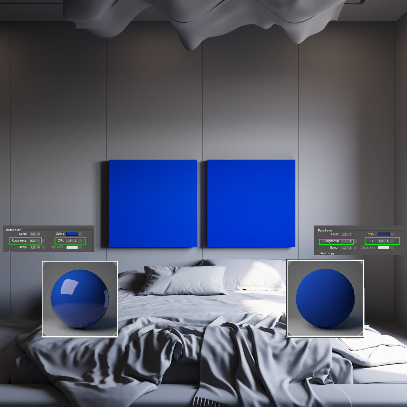 Видим, что даже на 1.5 коэффициенте мы уже почти не видим влияния диффуза на итог. Почти все "забито" рефлектом. Напомню, что материалы одинаково синие.