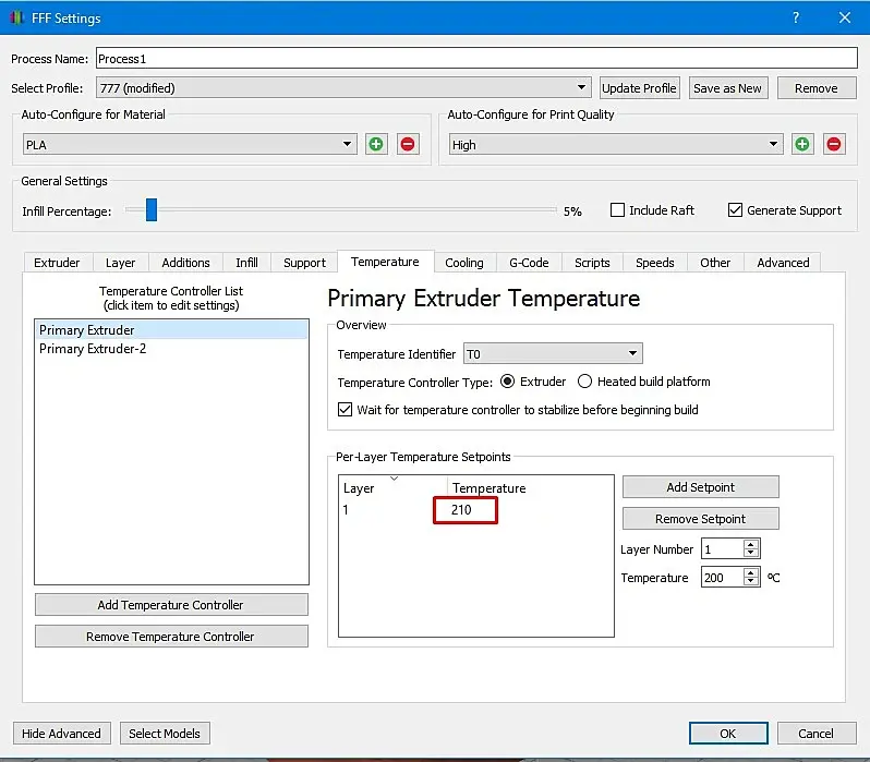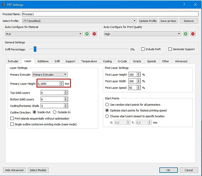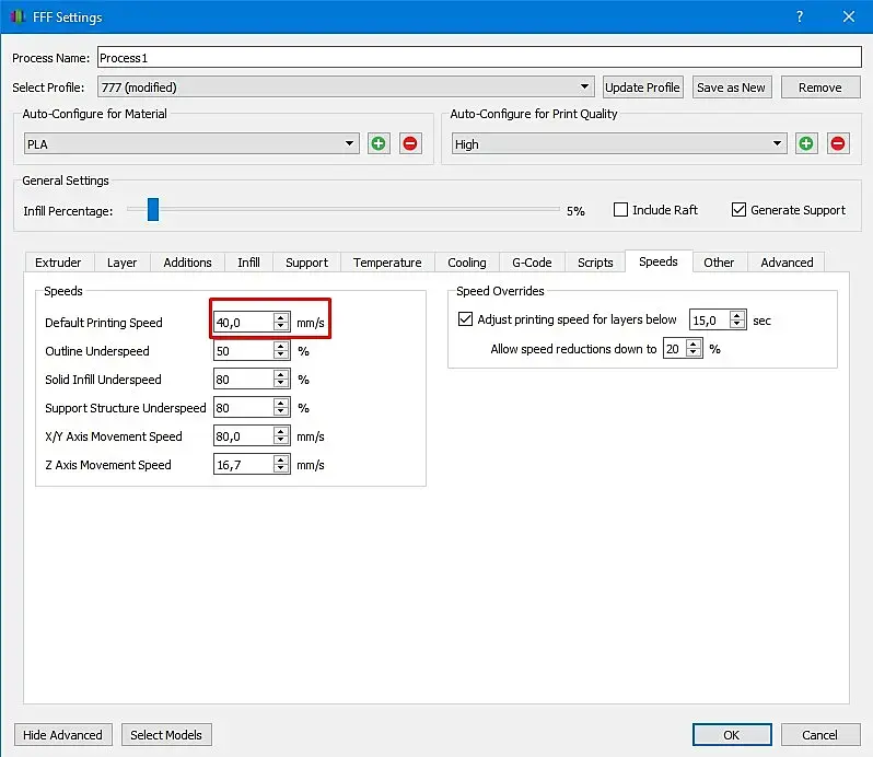 Печатаю я на принтере Ender-3 пластиком PLA и соплом 0,4 мм. Ниже приведу скрины основных настроек Simplify 3D. Настройке (на моем принтере и на моем пластике) работают отлично!