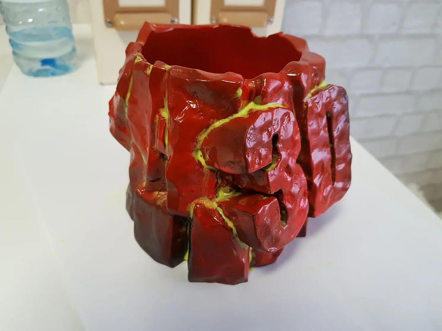 Когда просо слой грунтовки наношу базовую краску. В данном случае черную и флуоресцентную красную. Красная нужна для эффекта огня в разломах камня. Краску, после грунта можно использовать любую, даже на растворителях, до пластика она уже не доберется.