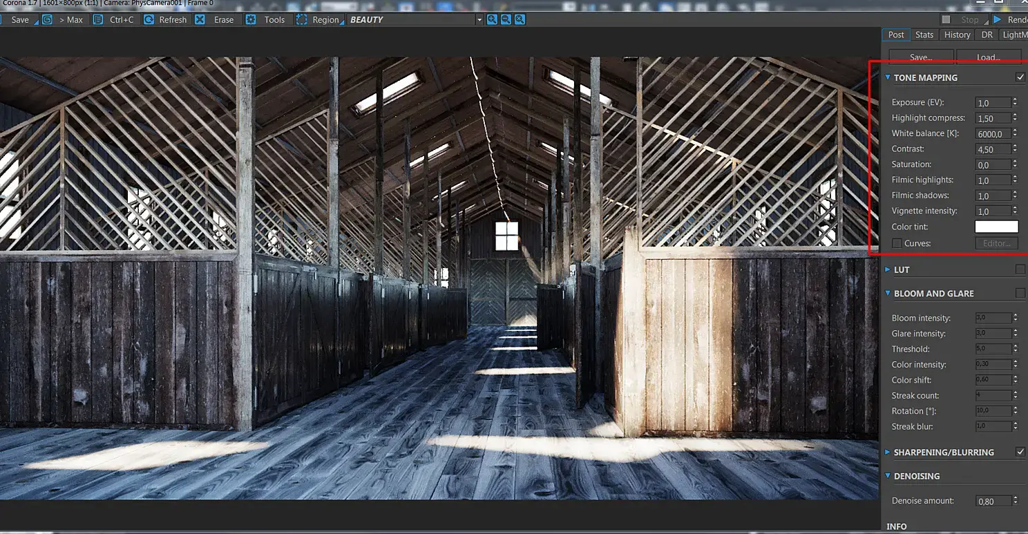 Следующий этап это построение объема. От большего к меньшему не особо задумываясь о деталях.Строим каркас конюшни , расписывать процесс моделинга я не буду скажу лишь то что для создания досок используйте FloorGenerator. Причем 80% того что есть на данном скрине сделано именно им FloorGenerator- работает очень просто и я думаю его используют практически все визуализаторы так что нет смысла в рассмотрении данного плагина. Вот мы наконец то набросали объем и возникает вопрос а что собственно дальше? Вариантов не много, можно моделировать детали и наполнять сцену либо уже начинать ставить свет. Я предпочитаю свет настраивать в начале проекта и периодически вносить коррективы. И так мы работаем в Короне а значит процесс постановки освещение прост.Нам не надо расставлять порталы, не надо крутить кучу настроек и тестить часами добиваясь нормального результата. Просто ставим CoronaSun и жмем на кнопку Добавить Корона Скай в ОкружениеПараметр Size делаем по вкусу у меня в данном случае 8. Но в экстерьерной сцене это было слишком много и я его снизил до 2. Второй этап это настройка ЛайтМикса .Жмем F10 и в закладке Scene нажимаем Setup LightMix.Все вы настроили))) В элементах появились слои с Небом и Солнцем.Так как я делал проект в Короне 1.6 то использовал PhysCamera а значит Макс установит по умолчанию свою экспозицию и вы не сможете изменять ее так как вам надо. Просто отключаем ееДелаем тестовый рендер и получаем такое Шум, засветы смотреть больно)))) А значит нам надо все это настроить. Включить Денойз, настроить экспозицию и выставить все параметры так как подсказывает интуиция. По сути нет идеальных настроек на каждый случай. Всегда надо потратить время на поиски подходящей комбинации))) Но есть те параметры с которых можно начинать.Немного доработав геометрию( добавил ворота на входе) делаю очередной тест и настраиваю все параметры кроме LUT Curves и BLOOM к ним мы вернемся позже. И так....Объем есть, свет есть но нет Крастоы)))Все плоское, бездушное.Давайте добавим воздуха. Добавляем в редактор материалов CoronaVolumMtlи перетаскиваем в GlobalVolumMtlПараметров универсальных по сути нет.Все зависит от сцены,экспозиции и освещения.У меня получились именно такие настройки. В экстерьерной сцене они другие, в подвале тоже хотя подвал в этой же сцене. Считаем....Дымка есть, объем есть а красоты нет)))) Но мы руки не опускаем. Что нужно для хорошей картинки ? Правильно детализация и освещение. Значит добавляем деталей и ставим свет.Сено пока не трогаем, расставляем модели примерно так выглядит результат Если с деталями все ясно то с ИС надо разобраться.Часто люди в Короне используют Лайтматериал как ИС и это ошибка. Первое в чем проблема это шум, вторая проблема это гибкость.Нам надо Люстры и бра сделать красивыми, а значит сделать им спираль в лампочке но освещать должен обычный ИС.Сам ИС должен быть чисто белым. Возникает вопрос почему же белым? А дело в том что мы будем в ЛайтМиксе менять цвет и переносить его на ИС. Так же выключить ему отражения, и тени.Вот параметрыРасставляем все ИС, разбиваем на группы и в ручную вносим в ЛайтМикс Теперь с помощью Лайтмикса настраиваем освещение .Яркость,цвет после чего желательно с помощью кнопки Scene перенести все в слой BEAUTY (когда закончите настраивать)Далее переходим в закладку Post и добавляем штрихов.Опять же тут все по вкусу и по ситуации. LUT выбираем банальным
