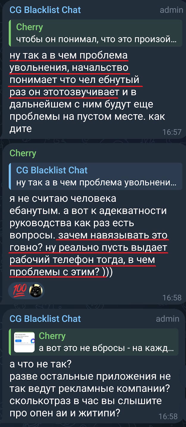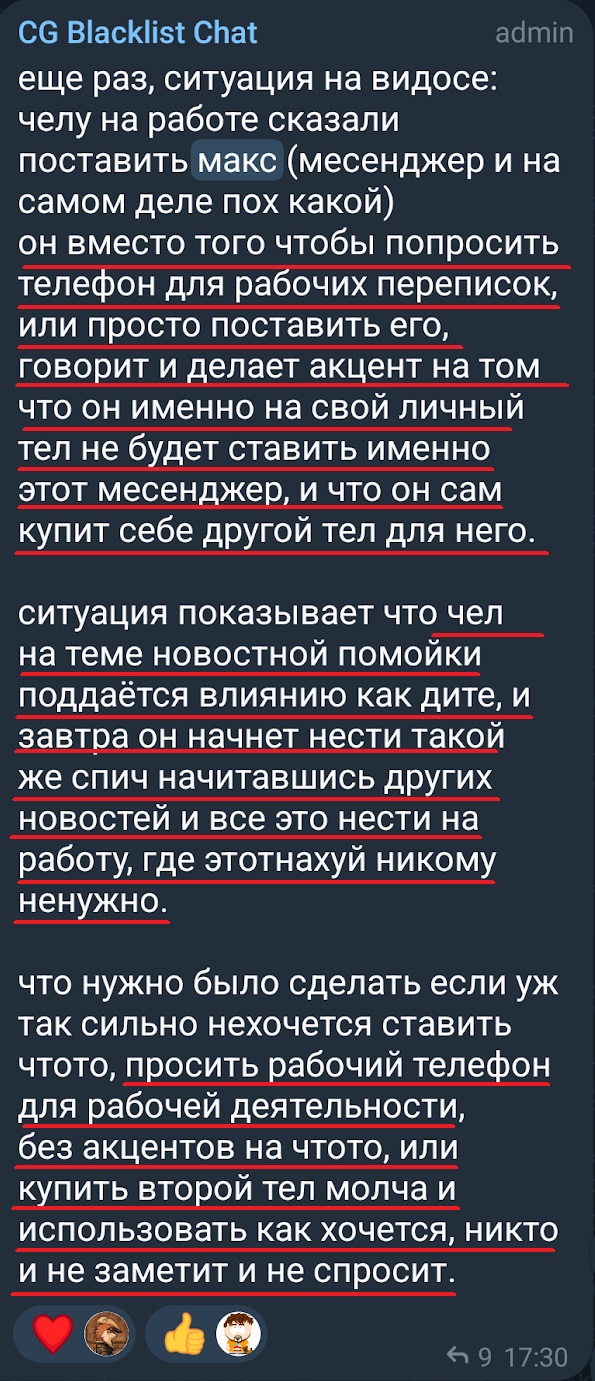 Суть вкратце - челу на видео сказали поставить новый модный-молодёжный-рекомендуемый мессенджер на телефон, он отказался, но предложил решение - купить другой телефон только для этого мессенджера. Его начальнику это не понравилось, весь диалог резко свёлся в сторону политики, и в итоге этой беседы парня уволили. Казалось бы, ну и чего? Всё довольно банально и понятно - в организации работает система "я - начальник, ты - дурак", и его бы уволили в любой другой день по любой другой причине. Первый же коммент этой новости от дорогого админа: