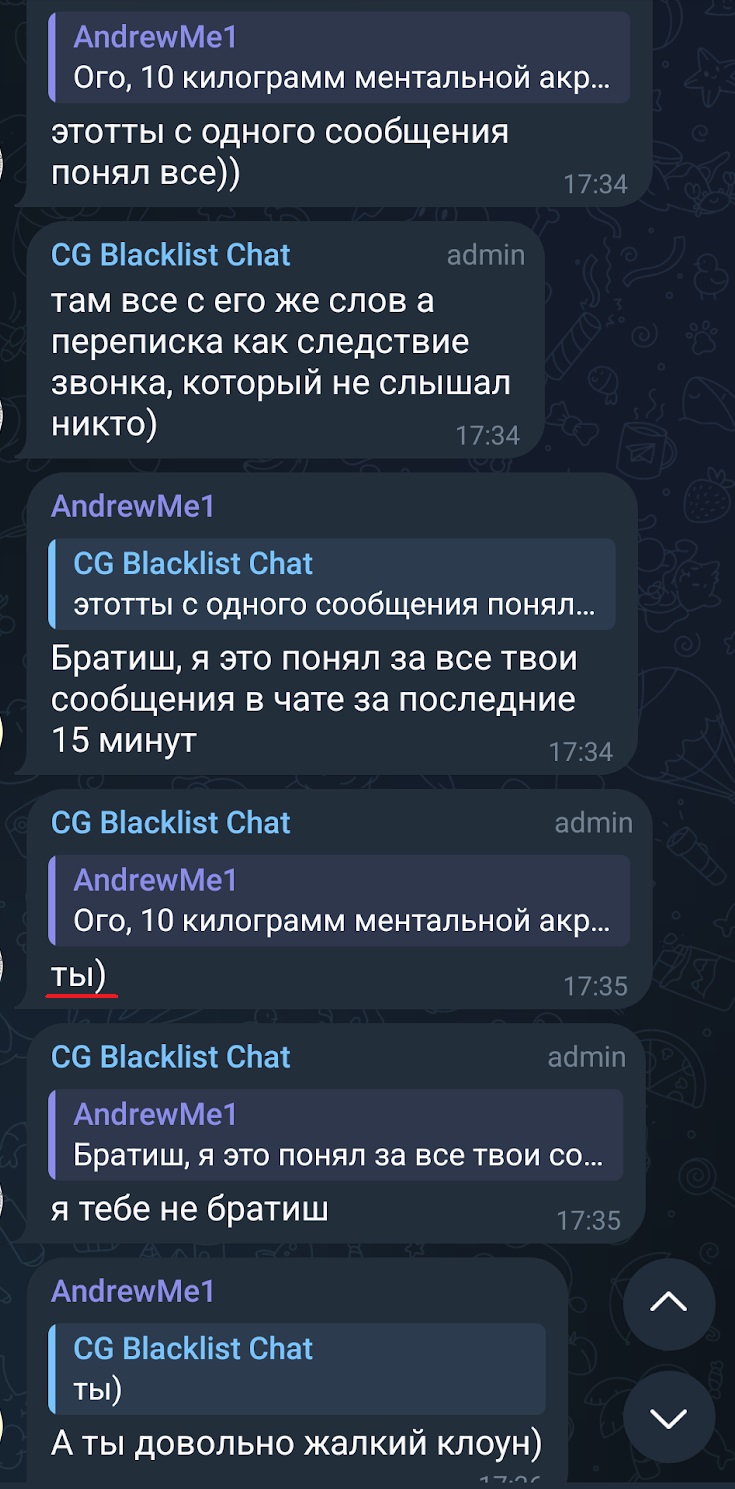 Админ всё ещё пытается играть в игру "вы ничего не понимаете и придумываете", переходя на косвенные оскорбления (в цитируемом им сообщении я спрашиваю "ну и кто еб*нутый?", цитируя админа).Собственно, я называю его тем, кем он и является - жалким клоуном. Все, кто сидел на форумах, чатах и прочих площадках в 00х, прекрасно понимает, что человек с ментальностью синдрома вахтёра не сможет такое стерпеть - это же вам не перед начальником стоять!