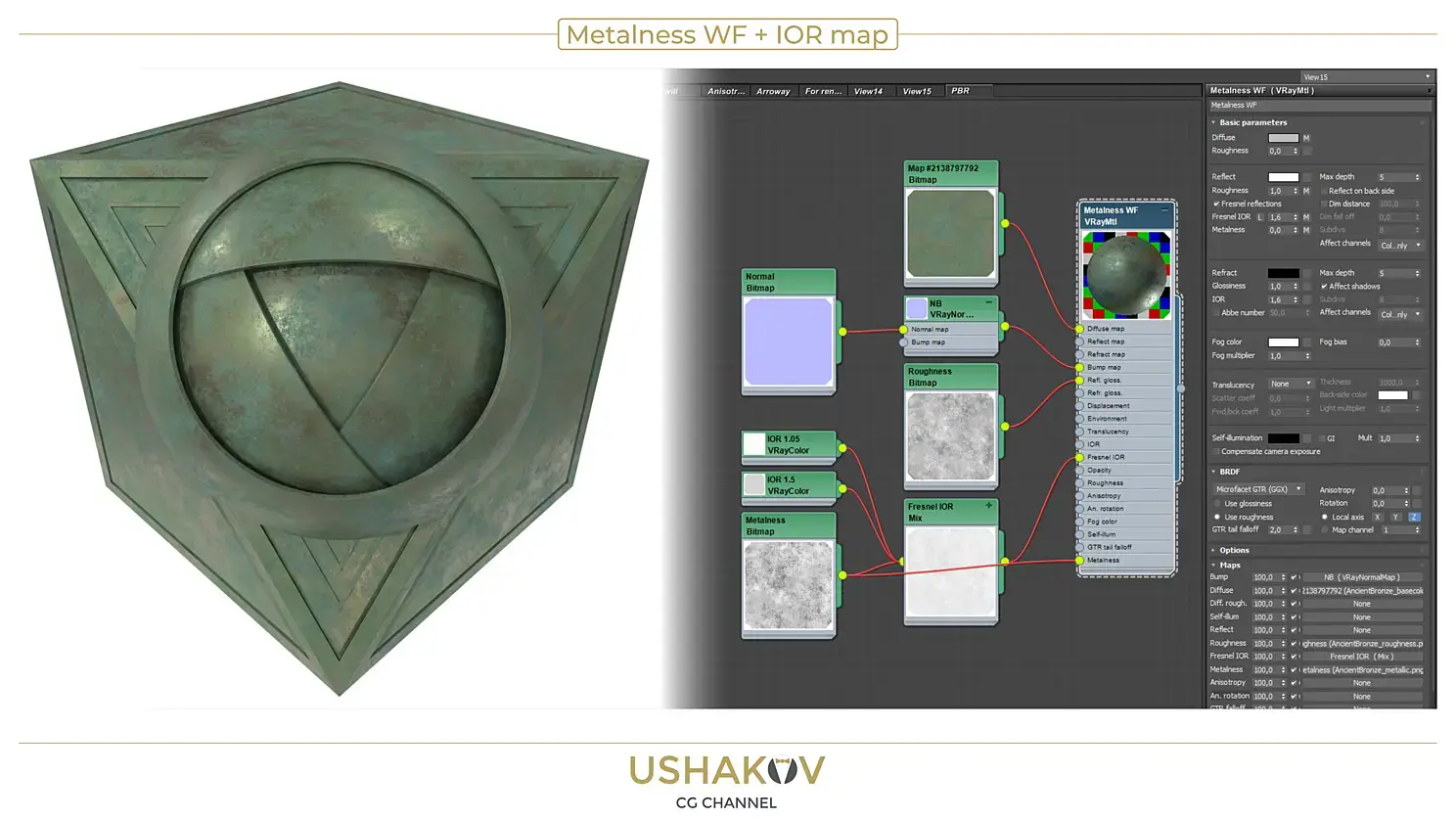 Здесь тоже, всё не «слава богу», но получше чем у Specular workflow. Работа со множителем IOR в этом режиме возможна и я могу установить необходимое по ситуации значение, без использования дополнительных текстурных карт. Но, как мне «посчастливилось» выяснить, комплексное значение IOR у металлов значительно ниже чем у диэлектриков. И в примере который я сейчас разбираю, так же есть необходимость подключения дополнительной карты с разными значениями IOR для металла и для окислившейся поверхности (диэлектрика).