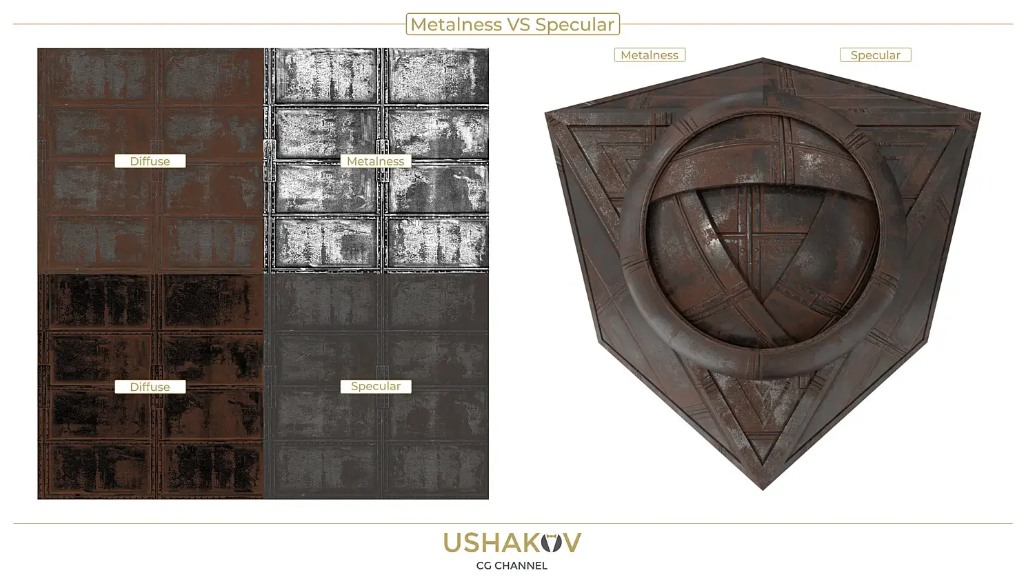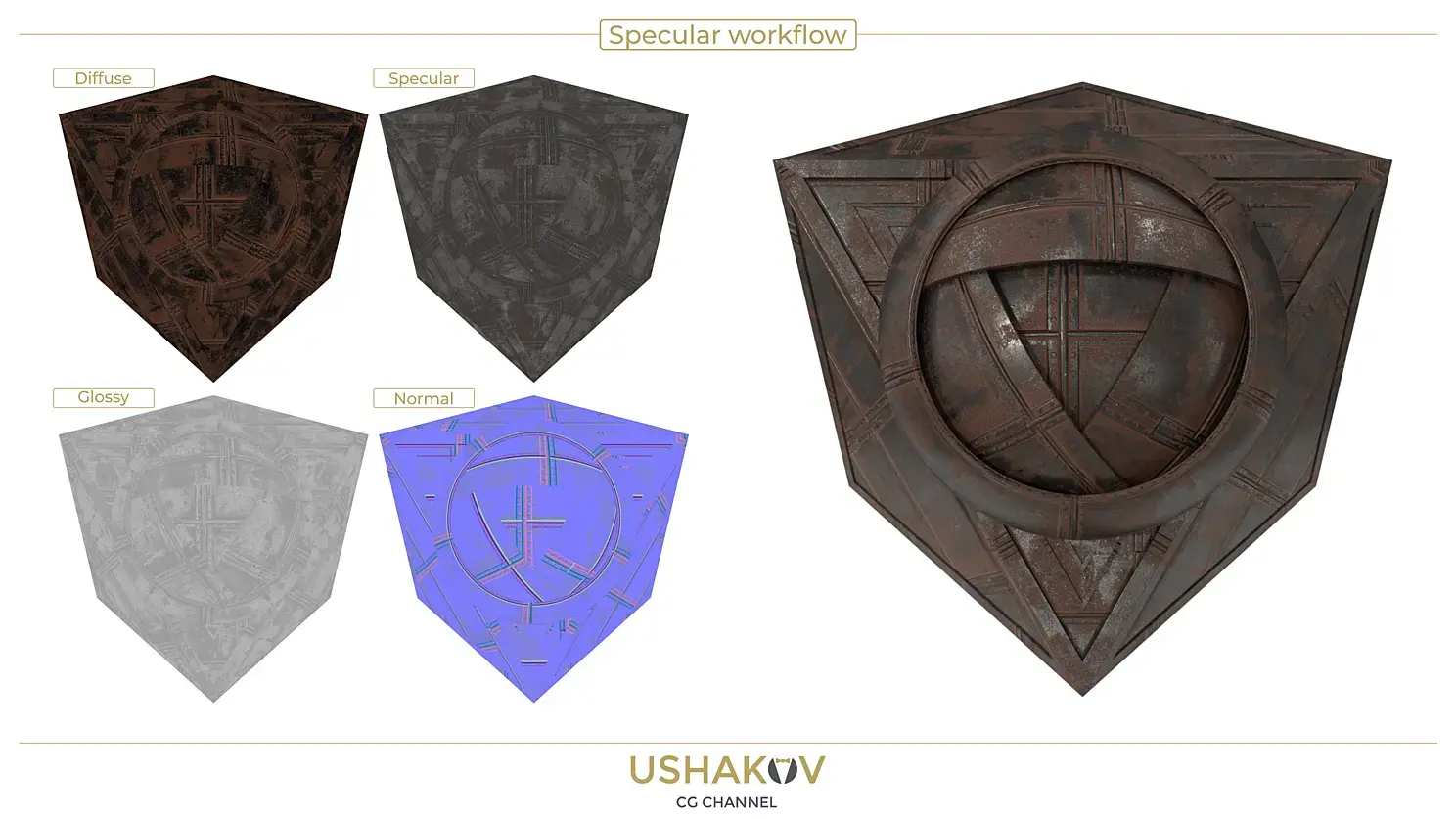 Для рабочего процесса Specular workflow — диффузная карта «закрашивается» черным в тех местах, где поверхность должна проявлять «металличность», там же, где поверхность является диэлектриком, задается необходимый цвет. Через текстурную карту Specular задается степень зеркальности объекта для диэлектрических участков через оттенок серого, а для металлических участков через необходимый цвет металла.