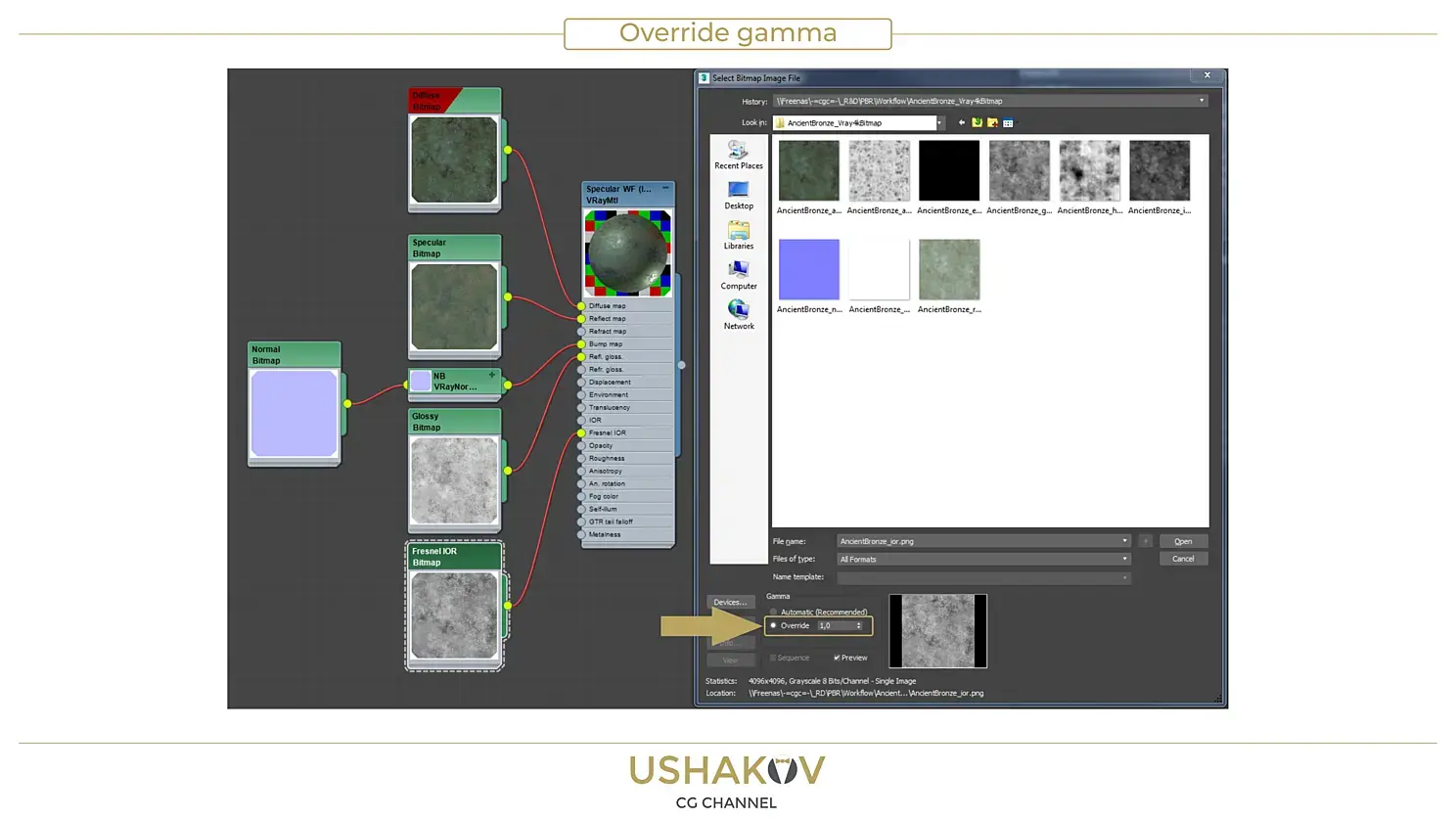 Некоторые ресурсы предлагают адаптированный к V-ray сет для Specular workflow. В этом сете есть дополнительная IOR карта, которую нужно подключать к слоту Fresnel IOR и так же немного измененная по цвету Specular карта. Такое решение делает шейдер более корректным и отвечающим принципам PBR.