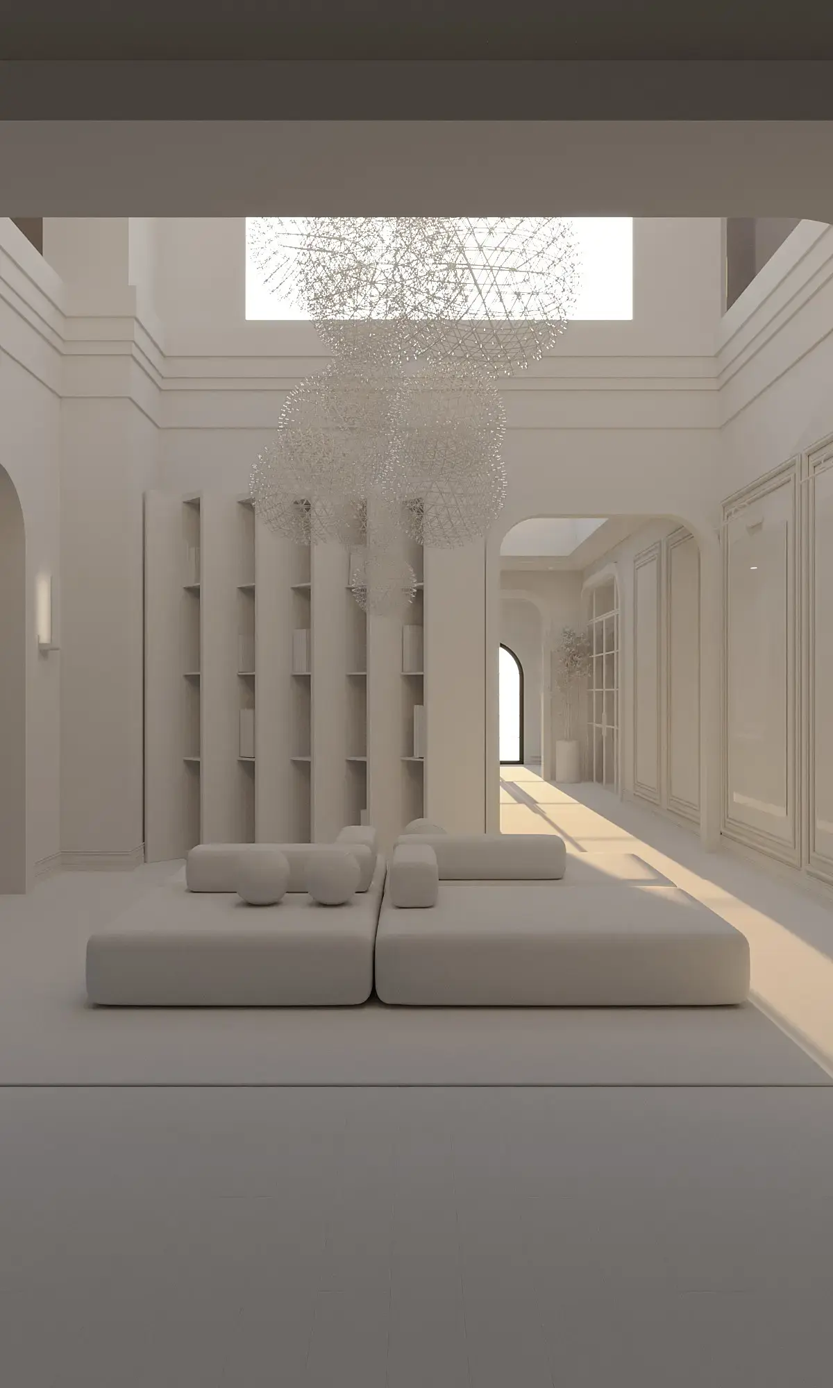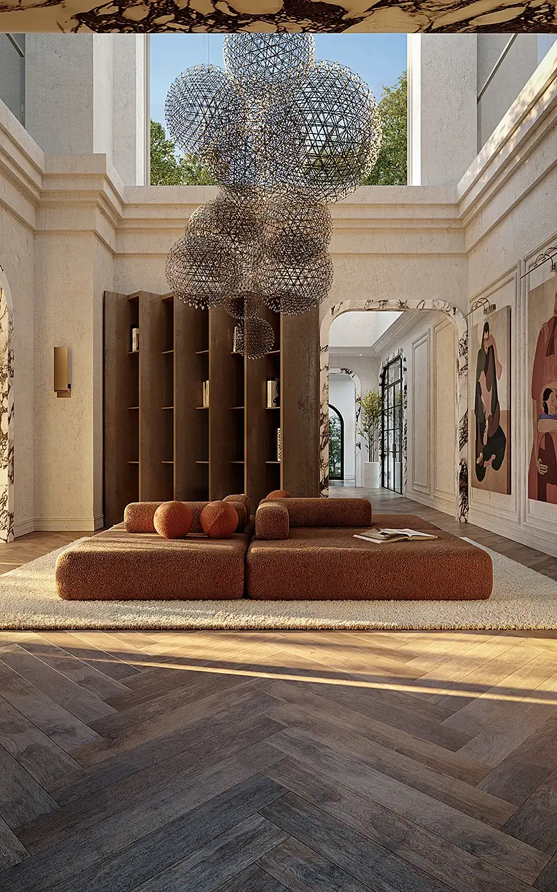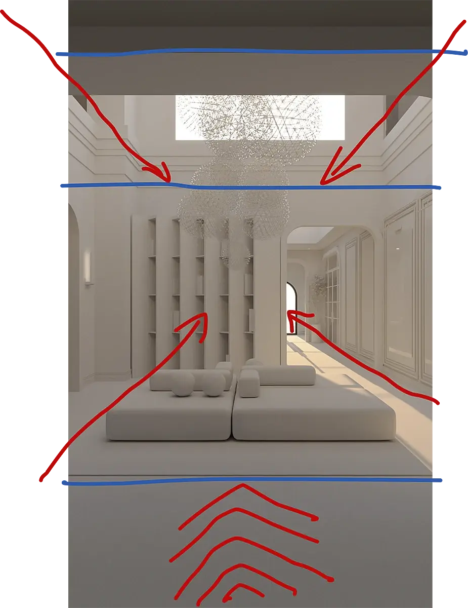 Даём довольно широкий угол камере для того, чтобы наши грани устремлялись в одну точку схода, зритель мысленно сам соединит их и кадр получится живым и интересным для просмотра. Также есть ритм который стремится вверх, большое пятно - пол и диван, дальше сужается шкаф и карниз, и оставим совсем узкую полоску от мраморного проёма в самом вверху. Этим приёмом мы ведем зрителя к окну наверху, а значит в нем тоже нужны какие то детали, которые уведут дальше взгляд.