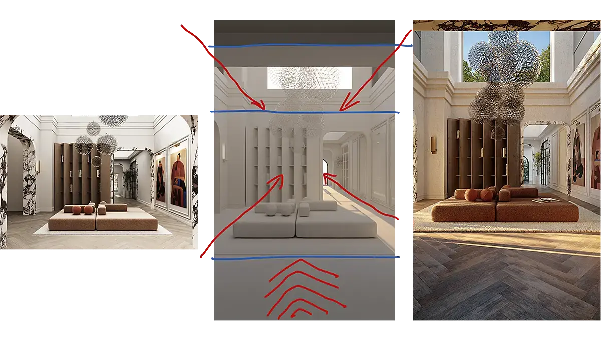 Сверяемся с референсами похожих помещений, убеждаемся что композиция получилась. Например на этом рефе хорошо работает перспектива и грани стремятся в одну точку схода.
