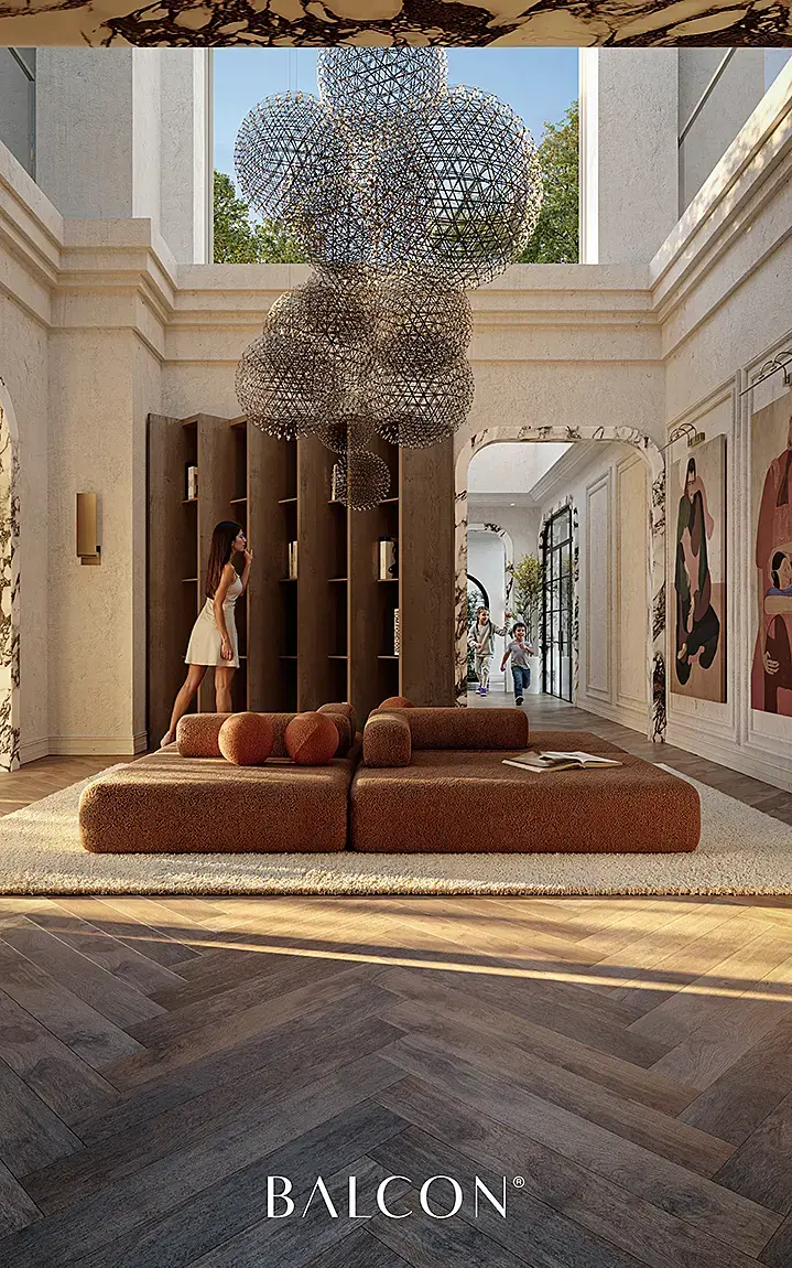 Здесь удачный контраст между светом и тенью. Холодный рефлекс от неба можно создать на нашем паркете, а также передать ощущение уходящего вдаль холодного пространства в коридоре. Плюс кадр затемняется градиентом по краям, что даёт дополнительную глубину.