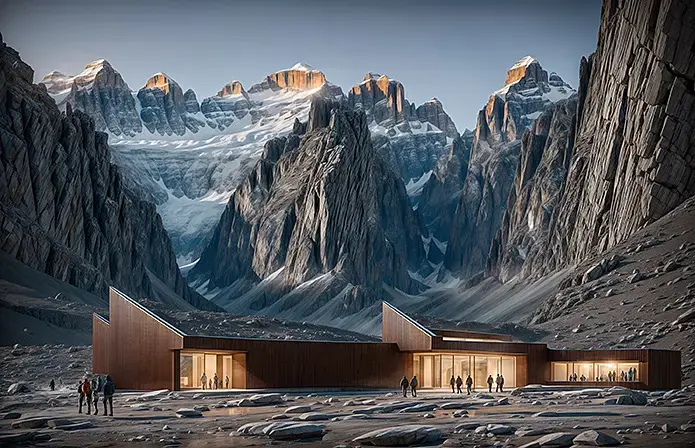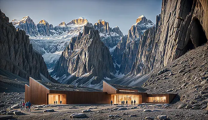 architecture visualisation, archdaily, mountains, walking people, hiking, minimalistic future building, entrance, parallel wooden planks, detailed background, warm light, artstation