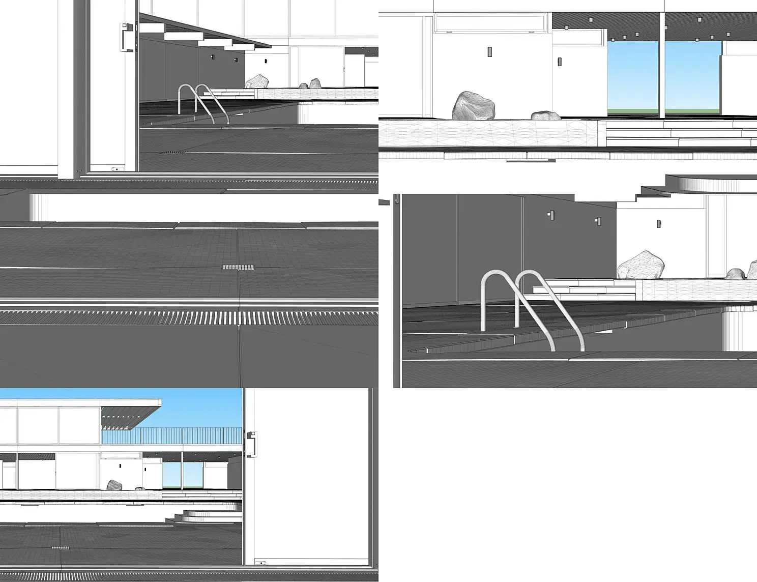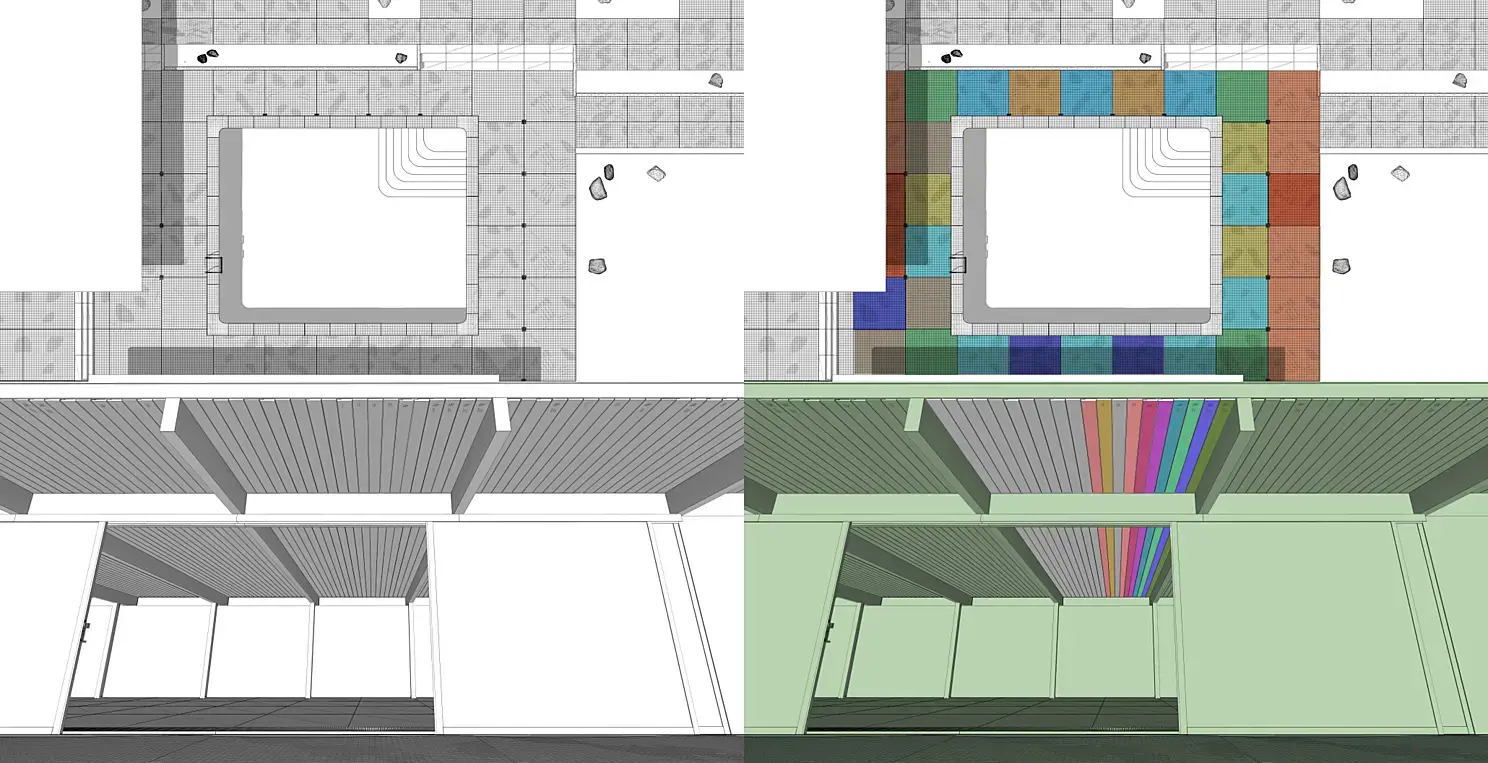 Мы решили изобразить жаркий летний день, который бы отлично соответствовал Калифорнии. С солнцем из «SketchUp» легко работать. Свет и тени точно регулируются под наши нужды, вот почему мы решили сделать работу без «V-Ray Dome Light». Настройки были близки к базисным. Для постобработки (Photoshop) мы также отрендерили следующие канали: «Diffuse Filter»; «Raw Light»; «RenderID» and «ZDepth».