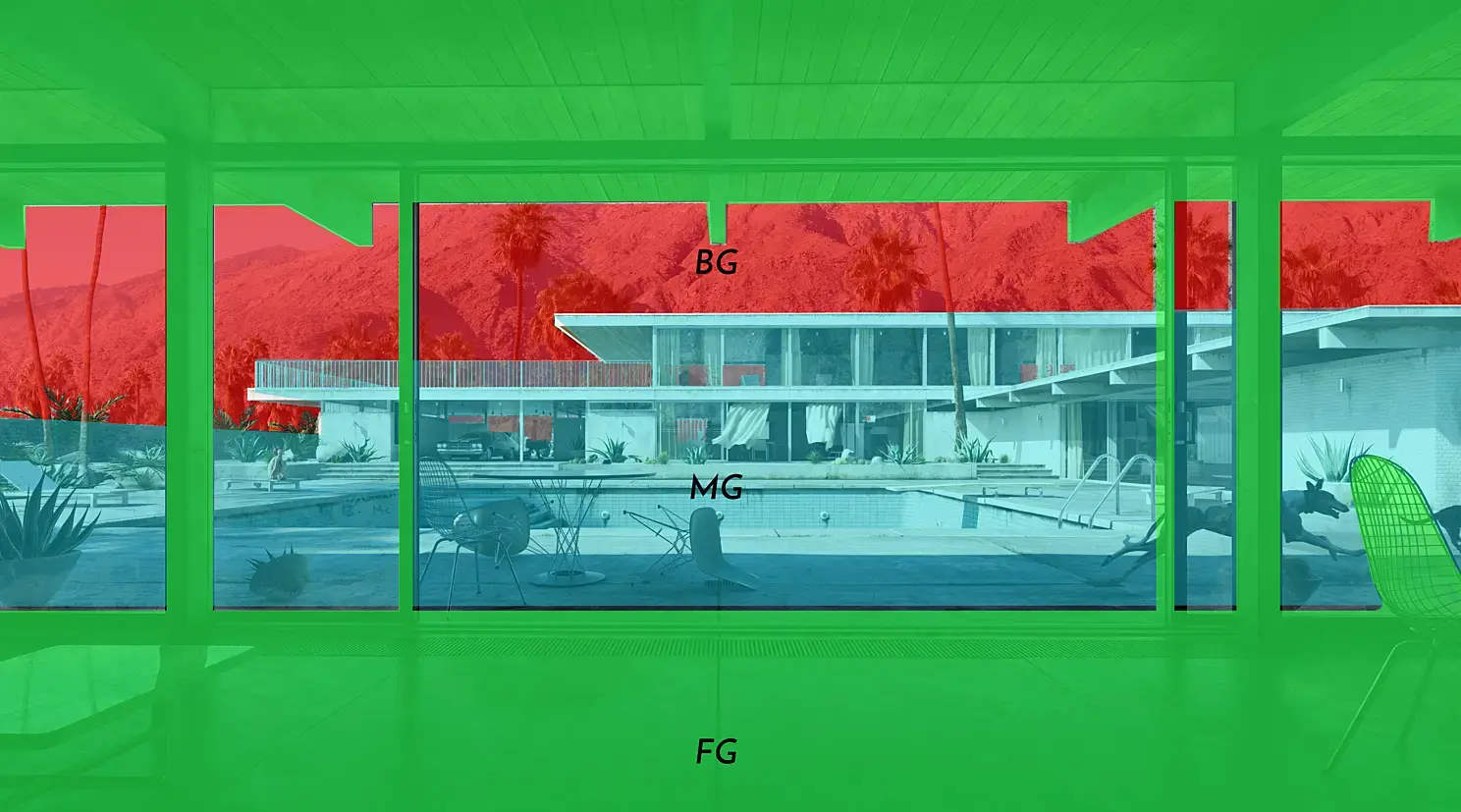 Следующие основополагающие принципы, на которые мы ссылались, когда обрабатывали изображение. Чтобы создать изображение с глубиной мы работали с передним планом, средним планом и дальним планом. Также мы использовали обрамление. Размещение холодных цветов в тёплых оттенках также добавляет глубины изображению. Тема проекта («Стол и стулья») были расположены с помощью золотого сечения.