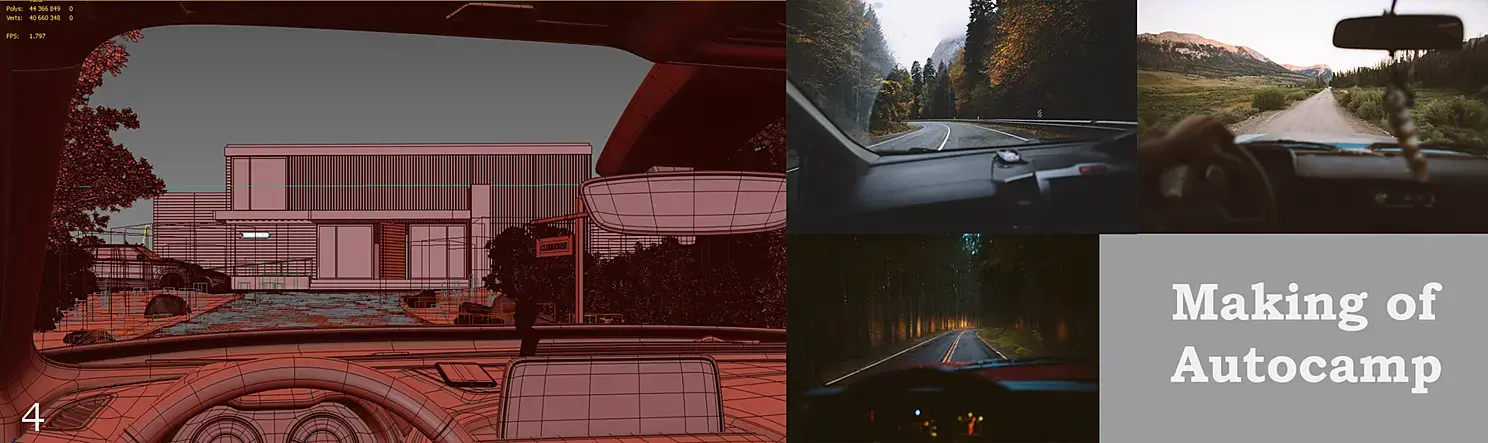 Добрый день коллеги. В этой статье расскажу все подробности создания серии картинок «Autocamp» . Эта работа выросла из реального рабочего проекта одного американского клиента. Для него создавалось всего три ракурса: 2 экстерьерных и один интерьерный, впоследствии я их доработал на свой вкус и сделал дополнительные рендеры для полноты истории, хотелось сделать именно связанную и атмосферную работу. Она состоит из 8-ми картинок и на каждую создавалась отдельная сцена со своими настройками света, материала и геометрии. Делал это для удобства и оптимизации ресурсов компьютера. Для смысловой связки всех картинок старался использовать одних и тех же фотошопных людей, но в разных позах и одежде, что придало целостность работе. Персонажей брал из сборника «Viz people Casual 7», они как раз хорошо вписались в ту атмосферу, которую хотелось создать. Этот проект мне понравился ещё на стадии работы с клиентом, он был очень хорошо проработан: интересная архитектура здания, ландшафт и разнообразие растительности придали изюминку этой работе.