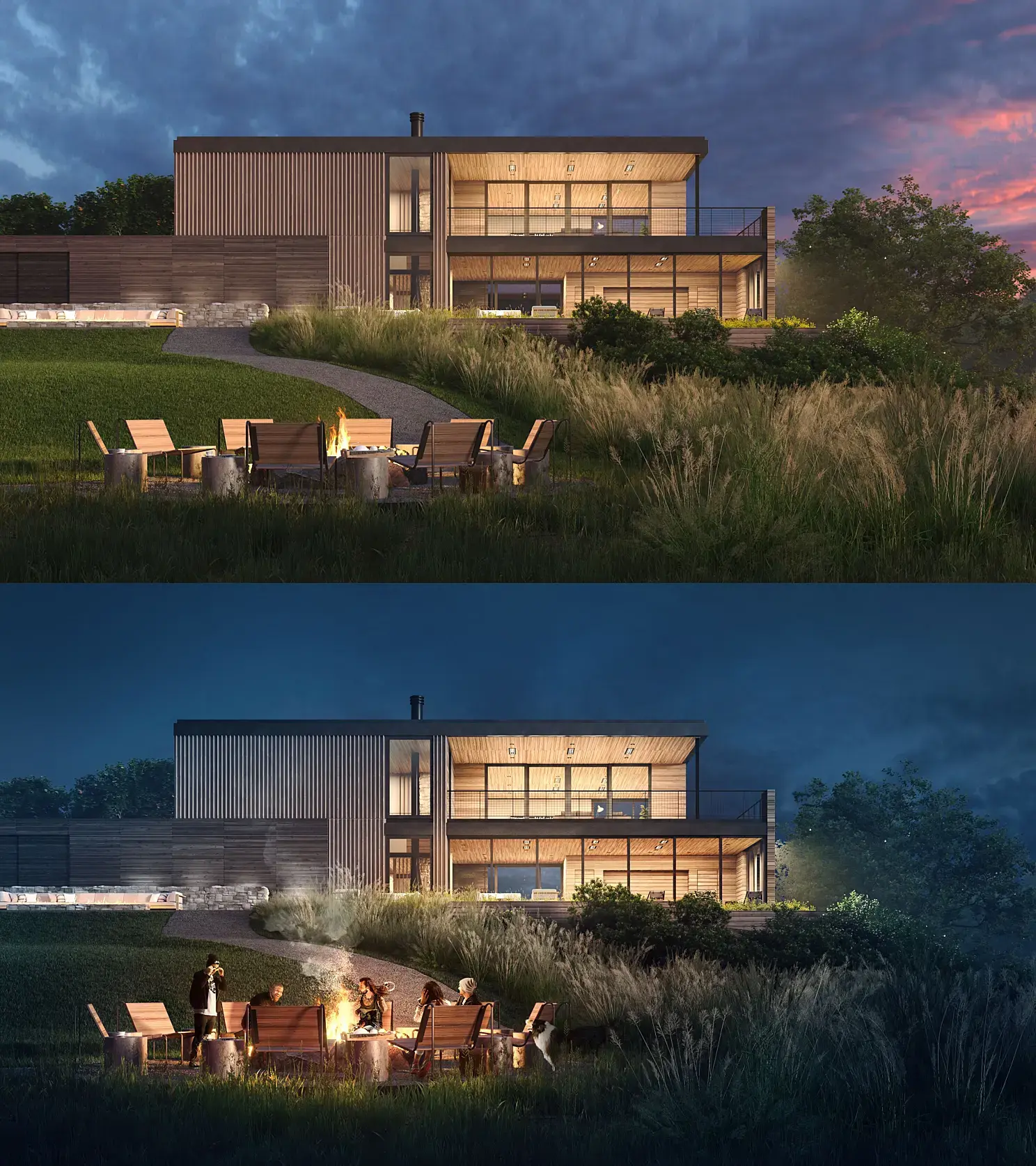 Три дневных ракурса освещались при помощи только HDRI карты. Здесь немного схитрил и использовал для слота Light одну HDRI карту «3DCollective_HDRi_029_1645_+32_8K.hdr», а для слота Direct Visible совершенно другую «176-hdri-skies-com.hdr». Это было сделано для того, чтобы освещение сделать немного обесцвеченным и слегка усилить контраст карты, а чтобы задний фон не менялся и был насыщенным, я его подменил совершенно другой картой. Это можно было сделать и потом в фотошопе, но мне захотелось видеть результат сразу. Передний план постарался затемнить, чтобы акцентировать внимание на дом. При помощи растений создал обрамление по краям и сверху, а 3-ий кадр (вид снизу-вверх на дом) мне особенно понравился. Богатая и пышная растительность очень красиво смотрится при таком освещении и это создаёт необходимую атмосферу.