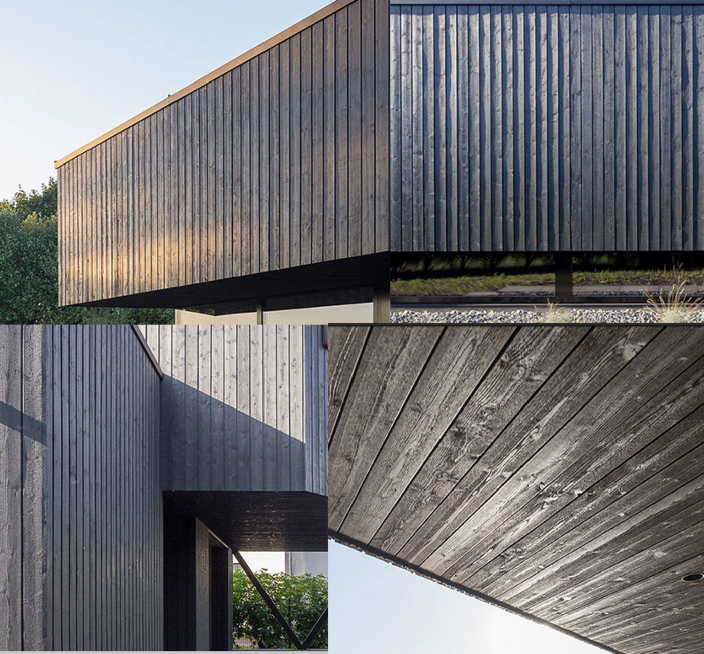 Начну с главного материала здания - чёрных досок на фасаде. Хотелось сделать его интересным и выразительным. Посмотрев референсы, отметил для себя, что у них довольно сильный бамп и они немного деформированы, рефлекс также хорошо заметен, особенно под углом.
