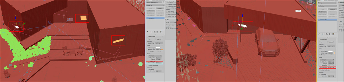 На вечерних ракурсах меня не совсем устроила сила света от ИС. Поэтому решил использовать несколько дополнительных фейковых плейнов, чтобы добавить выразительности теням. Это усилило свет и общую освещённость. Каждому плейну индивидуально настроил размеры и накрутил параметр Derectionality, чтобы тени были более резкими. Для заполняющего синего света использовал HDRI Peter Guthrie 2003 Dusk Blue.