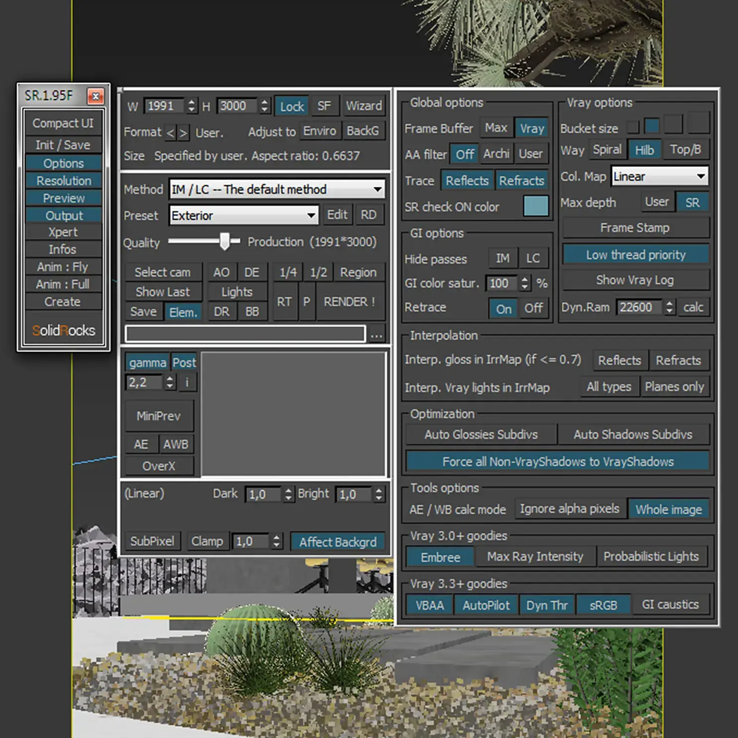 «SolidRocks» имеет уникальный подход к настройкам «V-Ray» (который вроде бы как был добавлен в недавнюю версию «V-Ray»). Интерфейс предельно прост для взаимодействия, если Вы имеете базовые знания о настройках «V-Ray», он, в основном, более интуитивен и является более дружественной версией интерфейса настроек «V-Ray». Следуя той философии, о которой я рассказывал в начале, «SolidRocks» может быть практическим решением для тех людей, которые не заинтересованы в доскональном изучении того, как работает «V-Ray» (забавно, я знаю... может быть просто не хочу погружаться слишком глубоко в технические аспекты настроек).