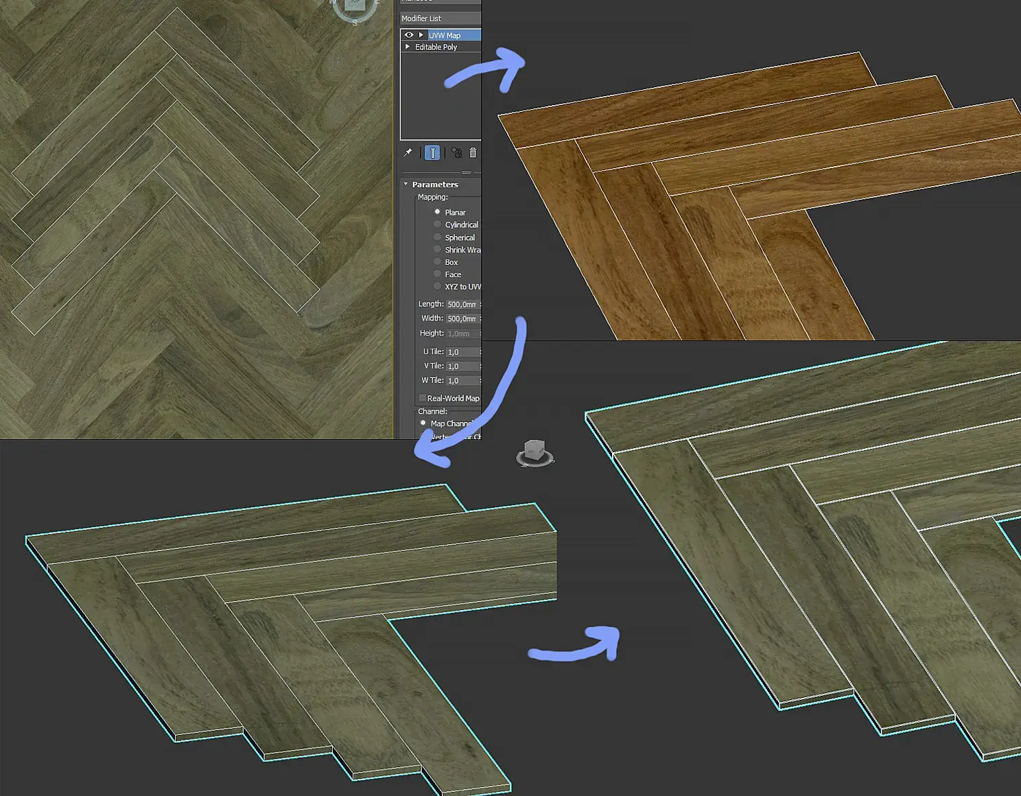 «Камин»Вертикальный кадр был продиктован формой камина. Такое расположение кадра подошло лучше всего, чтобы показать всю его масштабность . Так как сам камин был белым как и интерьер, акцентами стали бра и стул. Стул, в данном случае, и как предмет интерьера вписался и создает ощущение музейности, как будто бы стул для куратора галереи.Особенности кадра: Создание пола в данной работе было нетипичным. Я создал plane размером пропорциональным разрешению текстуры паркета. Придал модификатор uvw map-plane, для того, чтобы в дальнейшем заатаченные плашки стали с нужным маппингом. Поверх создал плашки. Сделал attach всех плашек с полом (аттачим к полу). Удалил plane, остались только плашки. Затем применил модификатор Shell (5-10 мм)-Edit Poly (добавил фаски, chamfer). Плюс данного способа в том, что вы нужной текстуре придаете геометрию, которую потом, можно редактировать как угодно. А саму текстуру можно в итоге состарить, местами добавить царапин, при этом все прекрасно ляжет на геометрию.