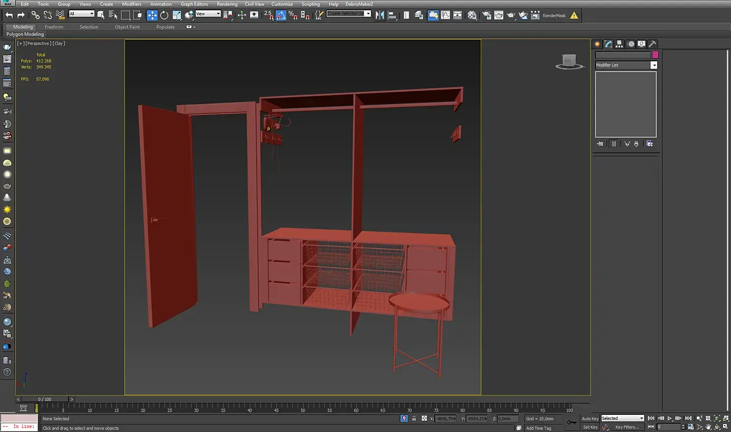 Так как я изначально планировал много ракурсов, хотел показать обеденные помещения, то я построил коробку всей квартиры и уже потом делил ее на помещения таким образом, чтобы можно было делать кадры из коридора с открытыми дверьми.