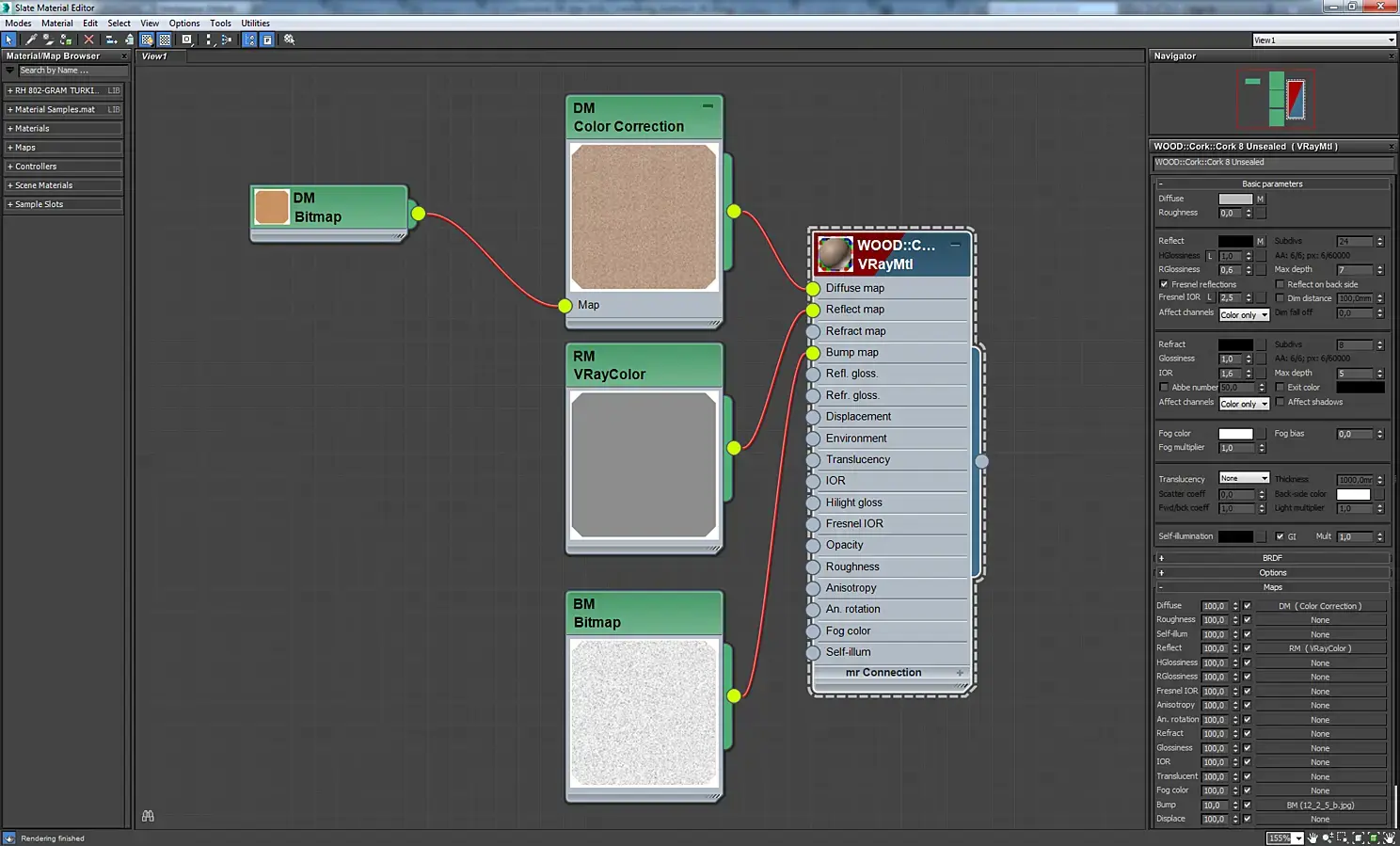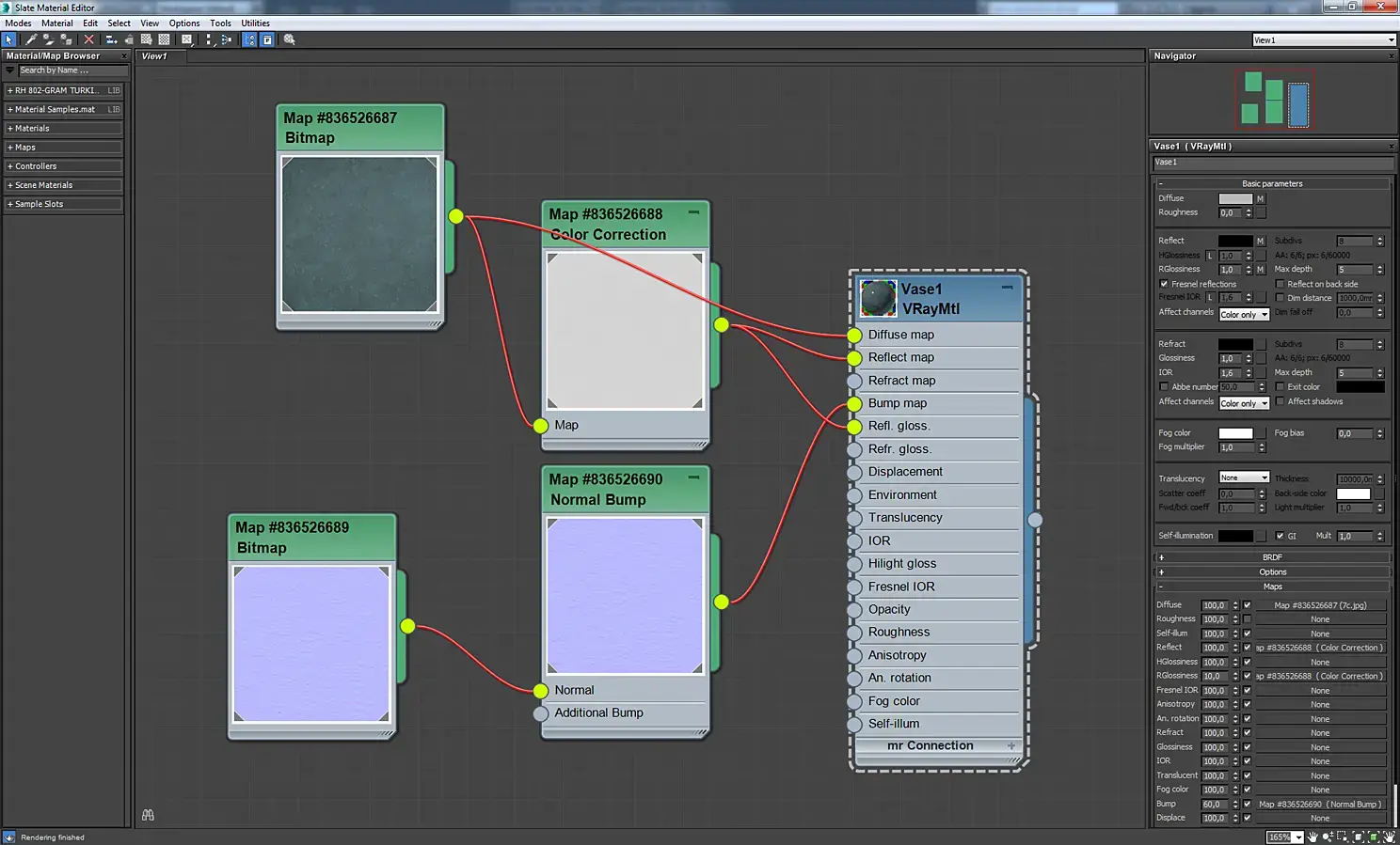 Материал экрана телевизора. Это VrayBlendMtl, в котором смешиваются два материала стекла, отличающиеся цветом и параметром Rglossiness. Аналогично сделаны зеркала с отпечатками пальцев, экраны мониторов, загрязненное оконное стекло.