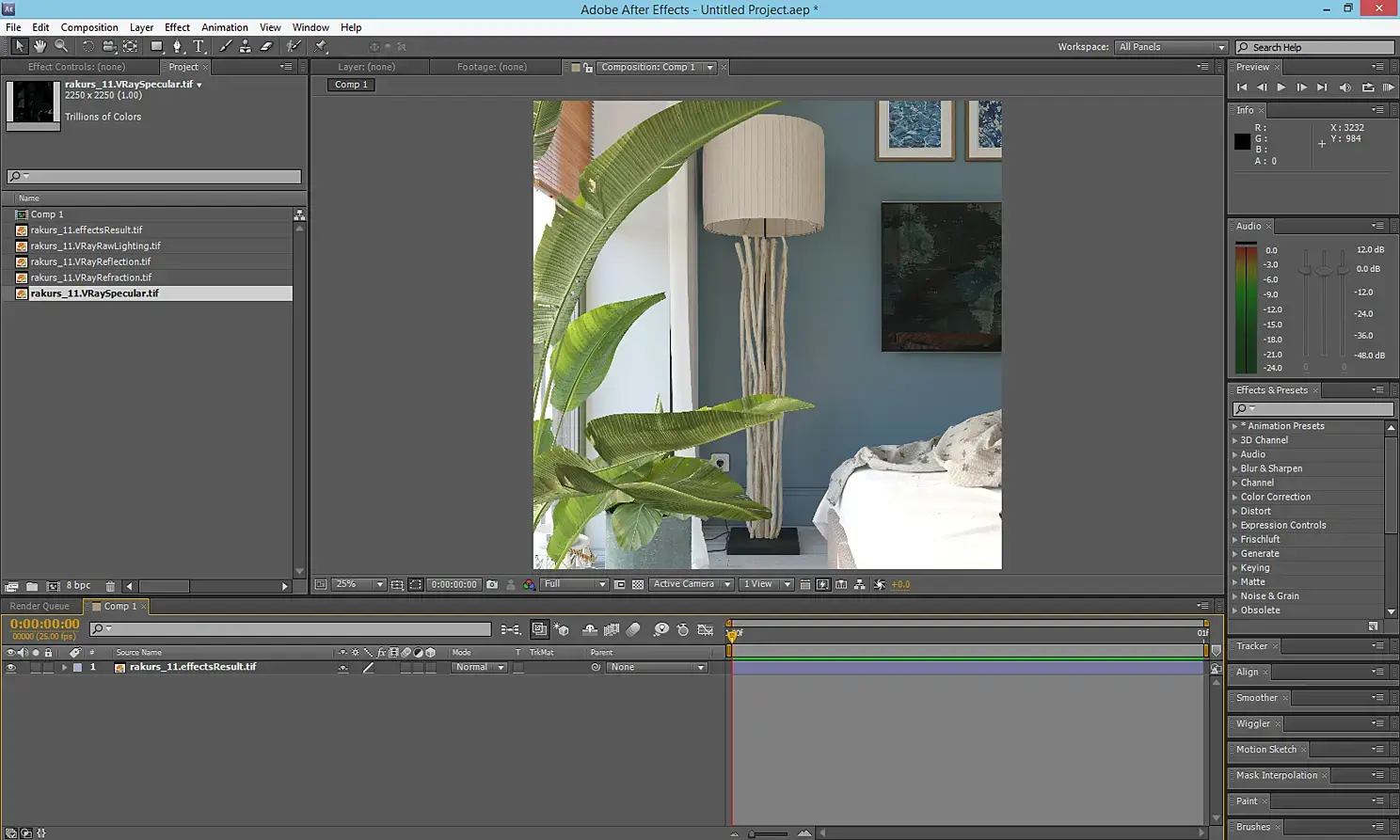 Постобработку я обычно выполняю в After Effects. Кроме основного рендера, были дополнительно посчитаны VRayRawLightning, VRaySpecular, VRayReflection, VrayRefraction, ZDepth.