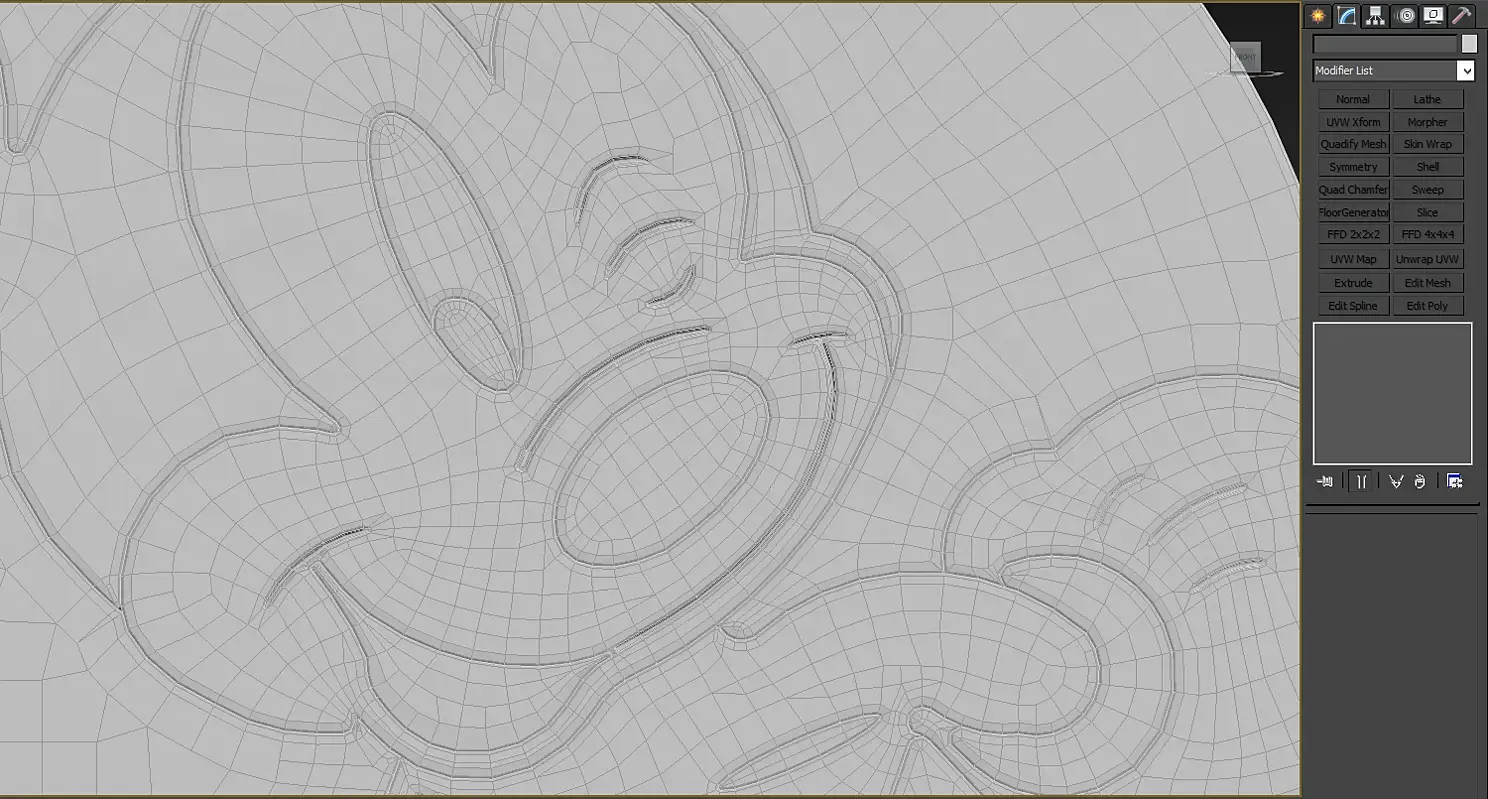На картинке выше - "носик", далее сложнее... например ушки. Тут можно наблюдать более детальное сокращение линий, это необходимо для снижение веса модели, что бы сетка не была плотной. Так же нужно учитывать моменты которые отвечают за "каркас модели". После применения TurboSmooth модель должна сглаживаться и не деформироваться.