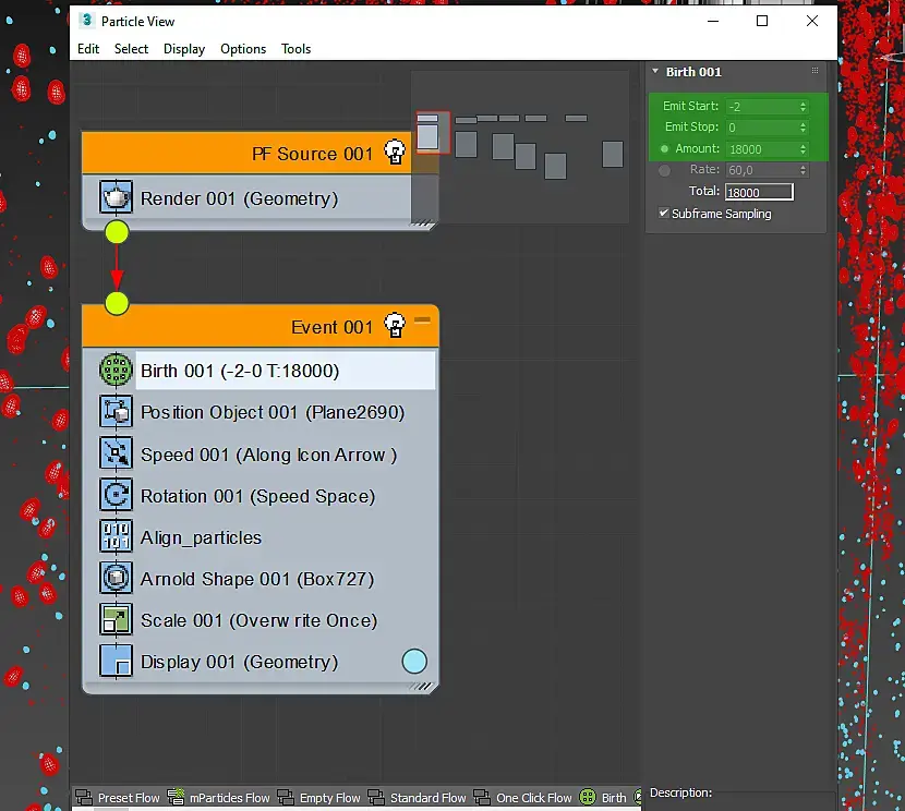 7) Берем файл с нодом выравнивания ( прикреплен к посту в группе, под статьей ), мерджим в сцену, далее он появляется у нас где-то рядом с нашим event в окне particle view, называется Align_particles ( пометил синим куда его нужно поместить — перетягиваем его в список нодов event ). Важно чтоб он шел после нода rotation.