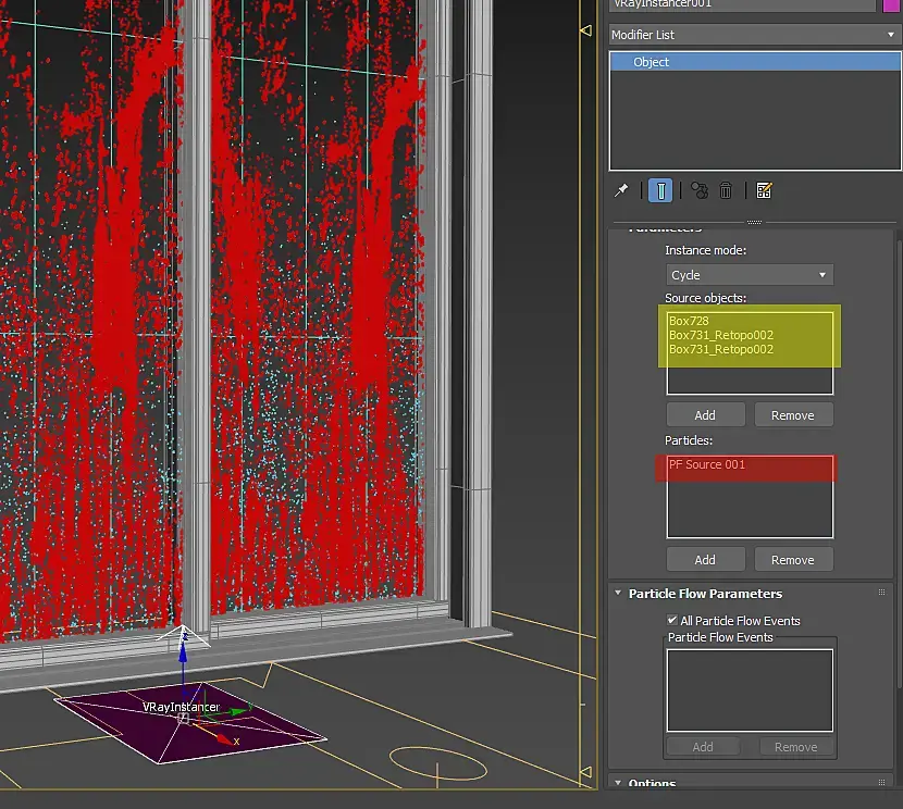 Теперь можно использовать Vray instancer — он заменяет наши частицы на геометрию. Его плюс в том, что можно использовать множество объектов для инстансирования, и множество систем частиц.
