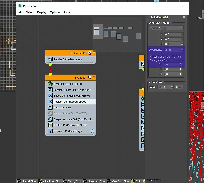 9) Можно добавить нод Scale для рандомизации размера частиц. Можно в ноде rotation повысить Divergence — для рандомизации вращения, но при этом надо не забывать что наши капли могут вращаться рандомно только по одной оси т.к они находятся на плоскости, и мы не хотим чтоб они проникали через нее под странными углами. Поэтому, можно включить Restrict Divergence to axis — и поставить единичку в нужную ось, по которой мы хотим рандомизировать вращение. Другие оси при этом останутся не тронутыми.
