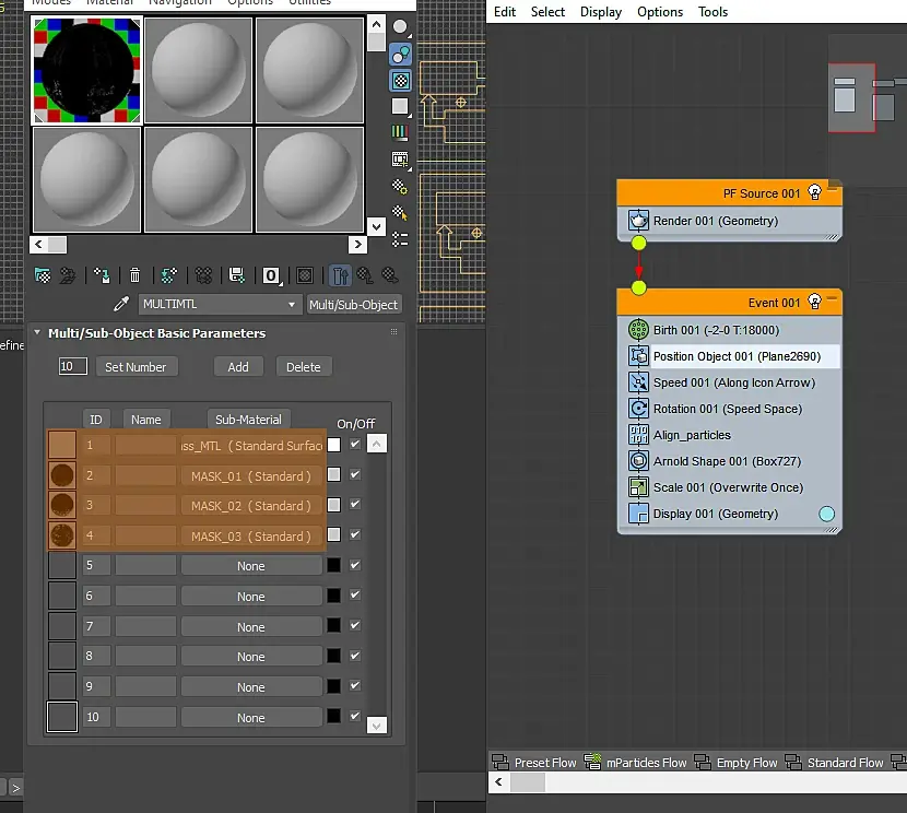 Осталось разобраться с материалом который контролирует маскирование — В 5 пункте мы включили density by material — эта функция говорит нашим частичкам использовать материал поверхности как карту плотности. Можно подумать — о какой карте речь, если наше стекло прозрачное? Но для этого есть функция Use sub material в которой можно указать ID другого материала. Поэтому мы сделаем для нашей поверхности мульти-материал, в котором материал с ID 1 будет материалом нашего стекла, а следующие материалы под номерами 2,3,4 и т.д будут любыми материалами в диффузию которых мы поместим наши черно-белые маски для частиц. Соответственно в ID сабматериала, в нашем ноде position object, мы ставим ID того материала, который хотим использовать как маску.