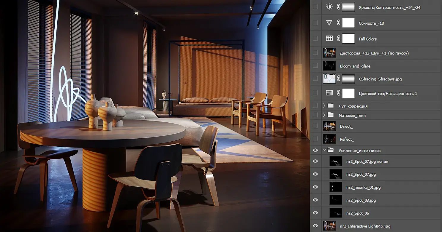 Подсветка потолочной ниши и неоновый светильник изначально планировались теплыми, но оценив общее настроение кадра было решено не уходить в желтушность и сделать избитую, но такую приятную глазу цветовую схему Teal and Orange. Всей душой эту схему ругаю, но как же хорошо она ложится в контексте закатного освещения. * Попутно с подключением новых источников корректировал яркость hdriкарты.