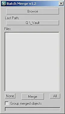 Нажимаем Browse, указываем папку куда скинули все модели. Скрипт подгрузит все найденные файлы в виде списка. Далее можно или вручную выбрать построчно нужные файлы, или просто нажать All, чтобы выбрать все файлы в списке. Нажимаем Merge, скрипт некоторое время подгружает все файлы в сцену, и все. Если перед этим нажать галочку Group Merged objects, то при загрузке моделей все объекты из каждого файла будут группироваться в одну группу.