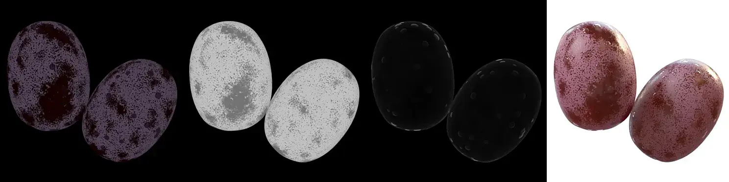Материал также процедурный, не используется готовых растровых текстур. По сути он состоит из стандартного VrayMaterial с прозрачностью в режиме Hard (wax) и ЧБ маски, состоящей из шумов. Эта маска через Mix в разной степени влияет на диффузный цвет, отражающую способность и глянцевость, матовость в прозрачности. На отдельном крупном рендере маски можно разглядеть, что в шум впихнуты два шума помельче. На темных областях основного шума- это светлые частые пятна, на светлом- это редкие темные пятна.