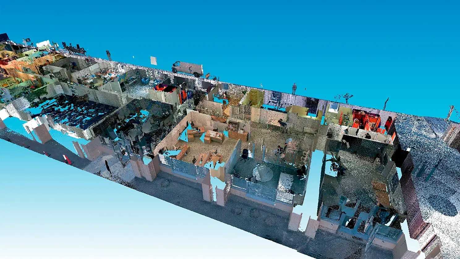 Здание общей площадью более 9000 м2 имеет в длину более 128 м и в высоту более 26м При таких показателях неточности в сборе исходных данных могут существенно отразиться проекте в целом, ведь, например, угловая ошибка в одну десятую градуса может «привезти» отклонение свыше 120 мм на другом конце здания. Чтобы выполнить работу с высокой точностью, но в тоже время быстро и НЕ дорого (да мы так умеем), мы выбрали комбинированный метод оцифровки здания: снаружи, по фасадам, работал сканирующий тахеометр Trimble SX-10, который выполняет обоснование, создает СК и заносит координаты внутрь здания. Где, работы по сканированию выполняются быстрым, компактным, но при этом довольно точным сканером от Leica – BLK360 – непревзойденного бойца «ближнего боя»