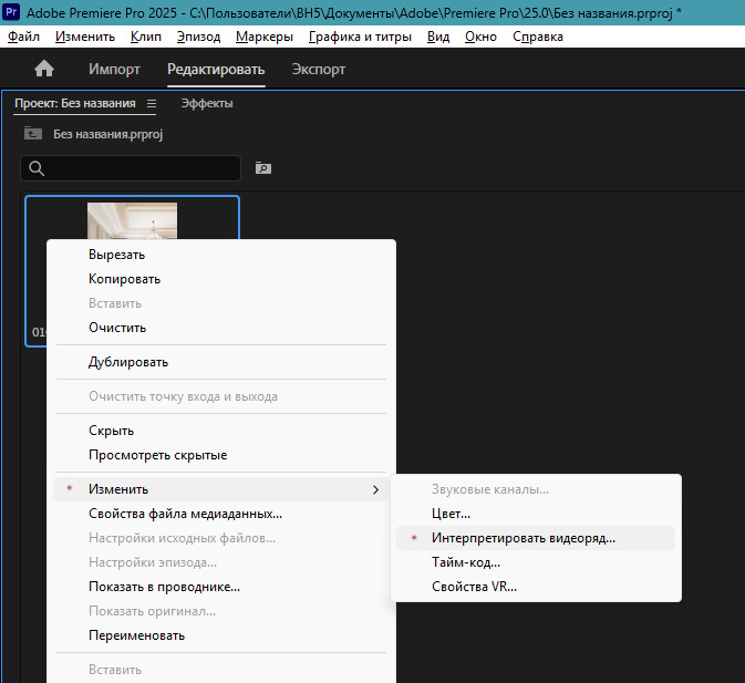 После того как вы выбрали исходный материал в левом верхнем углу у вас появится миниатюра вашего будущего видео. Щелкаем по нему правой кнопкой мыши и "Изменить" > "Интерпретировать видеоряд..."