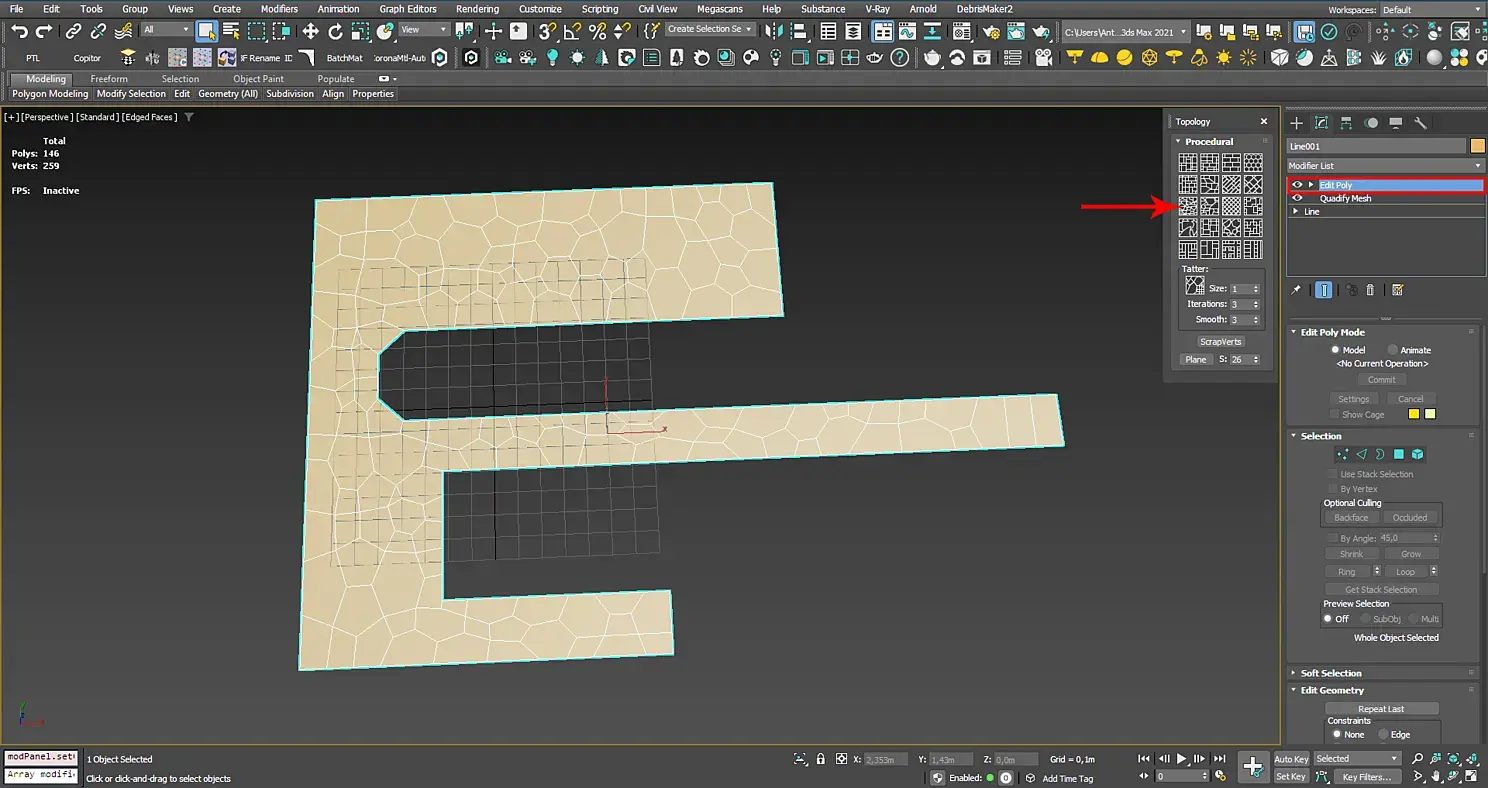 Чтобы выбор скрипта по методике Вороного сработал, у вас в сетке модификаторов, должен быть выбран Edit Pоly в верху сетки. Перед применением этого метода в сетке модификаторов нужно перейти в модификатор Quadify Mesh и настроить процент разбиения сетки в параметре Quad Size. Чем меньше процент разбиения, тем плотнее разбита сетка. Чем выше плотность сетки на этом этапе, тем меньше будут полигоны-кирпичики после применения скрипта. Таким образом мы регулируем масштаб наших камней.