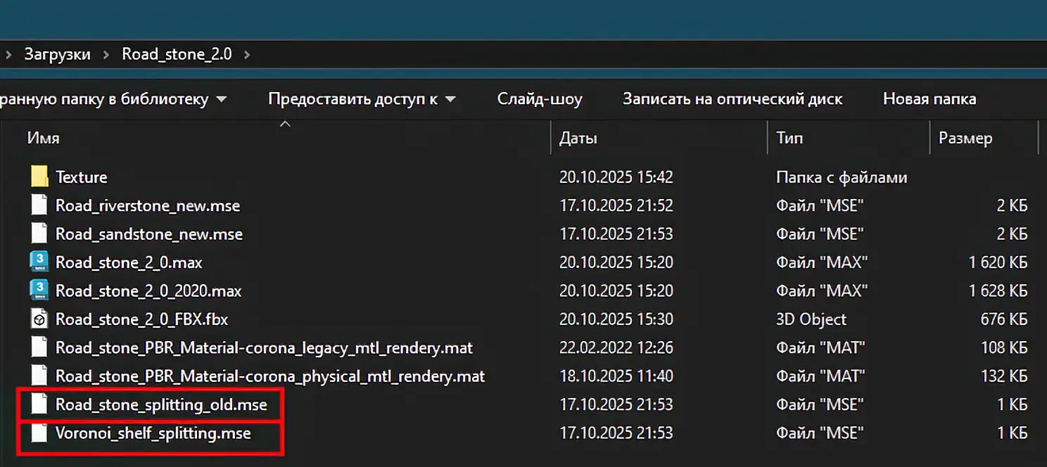 В папке со скриптами имеются библиотеки материалов и текстуры, настроенные для работы с Corona Render версий 3 - 11, которые можно загрузить к себе на диск и открыть в редакторе материалов из любого удобного места. Материалы там как для старой версии короны: Road stone PBR Material - corona legacy mtl rendery, так и для новой: Road stone PBR Material - corona physical mtl rendery. Все текстуры и материалы названы логическими названиями. Присутствуют материалы для морского и сланцевого камня, а также промежуточной засыпки мелкими камешками, если требуется.