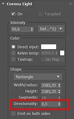 Какие же конкретные значения Directionality нужно устанавливать в CoronaLight, чтобы источник света (далее ИС) был направленным или рассеянным?