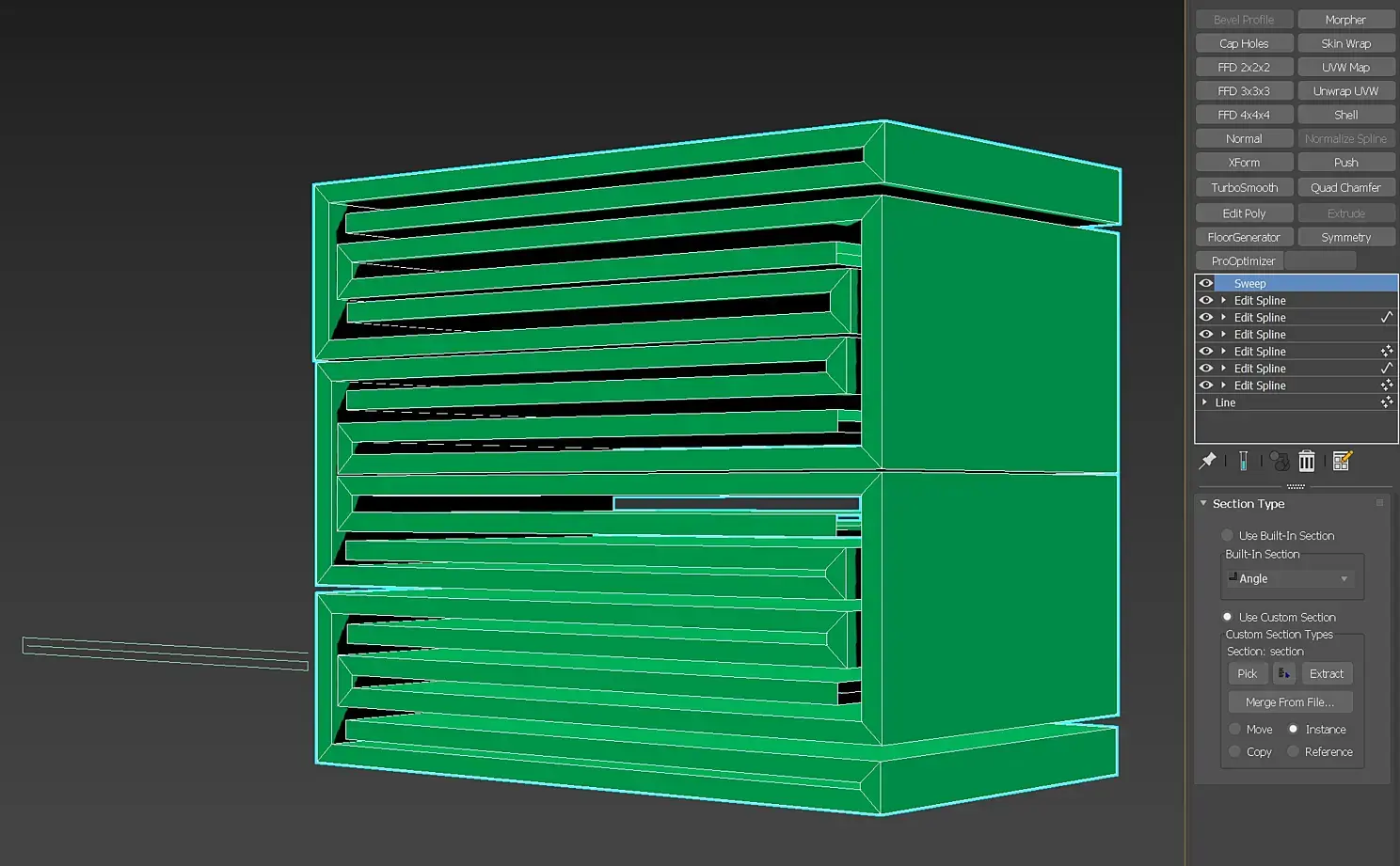 Удалим модификатор Sweep. Линию с шестью сегментами закрутить не получится, поэтому зайдем на уровень сегментов, выделим все горизонтальные и разделим их 10-ю вершинами.
