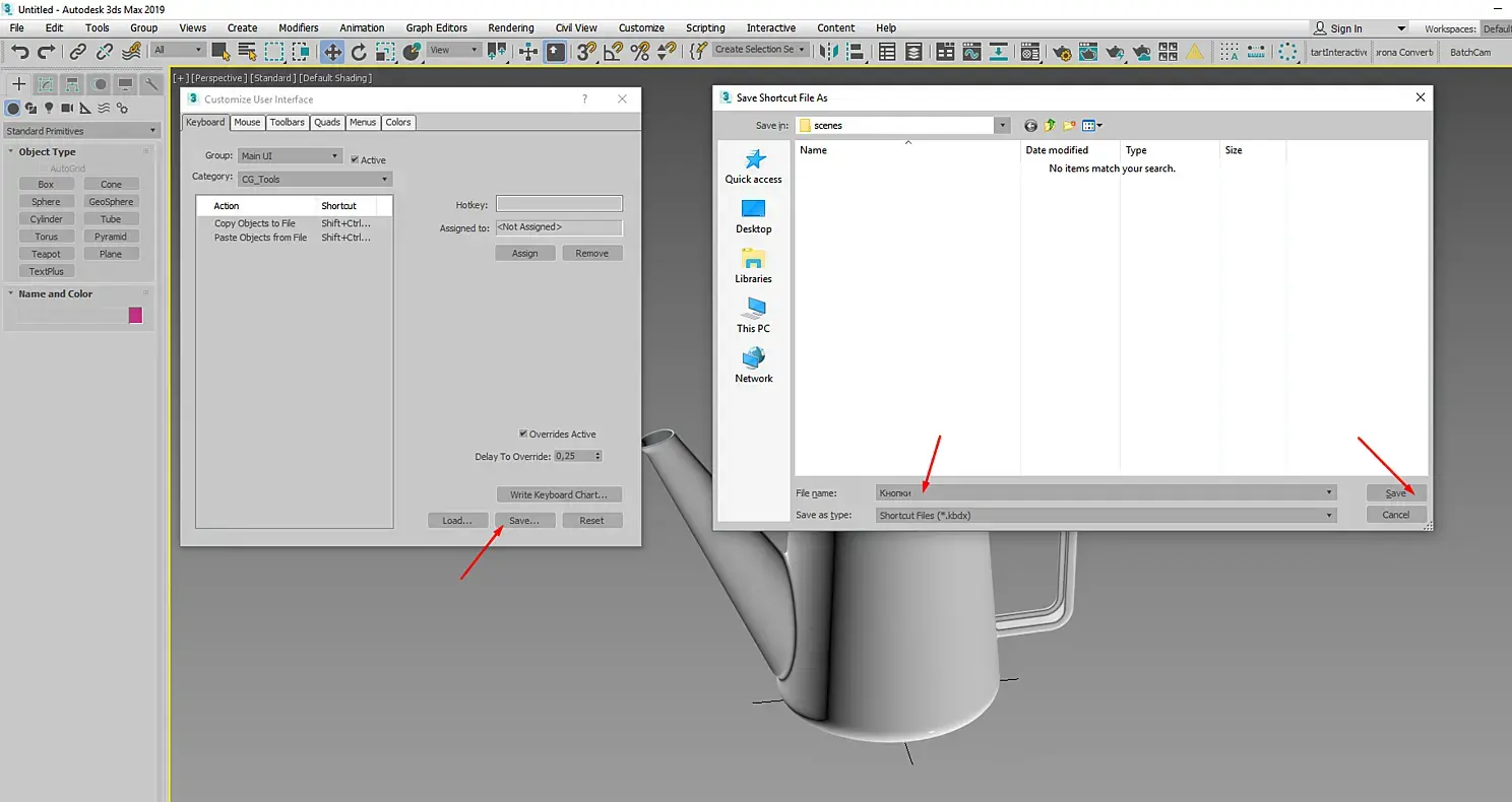 После того как мы указали наши клавиши, нужно сохранить это в отдельный файл, делается это для того что бы при запуске 3D Max по новой, кнопки не слетели и их не нужно было настраивать заново.
