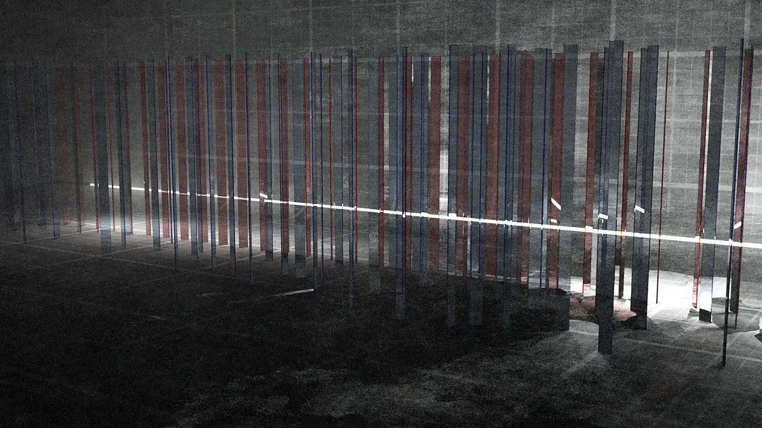 5) Три луча RGB. Это была одна из первых идей - чтобы луч разделялся на три, потом каждый из них окрашивался в цвет той стекляшки, через которую он проходил, a потом лучи уходили бы вверх, и упирались в диффузный потолок, таким образом создавая плавный красно-зелёно-синий градиент освещения сцены. На финальном рендере его почти не видно, из-за того что сам по себе первичный белый луч дал слишком много рассеянного света.