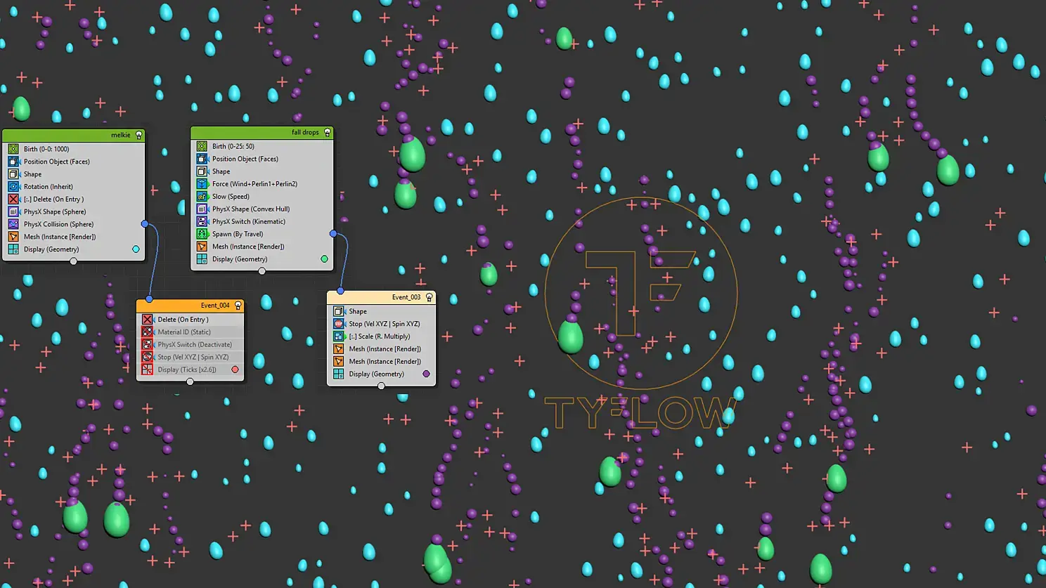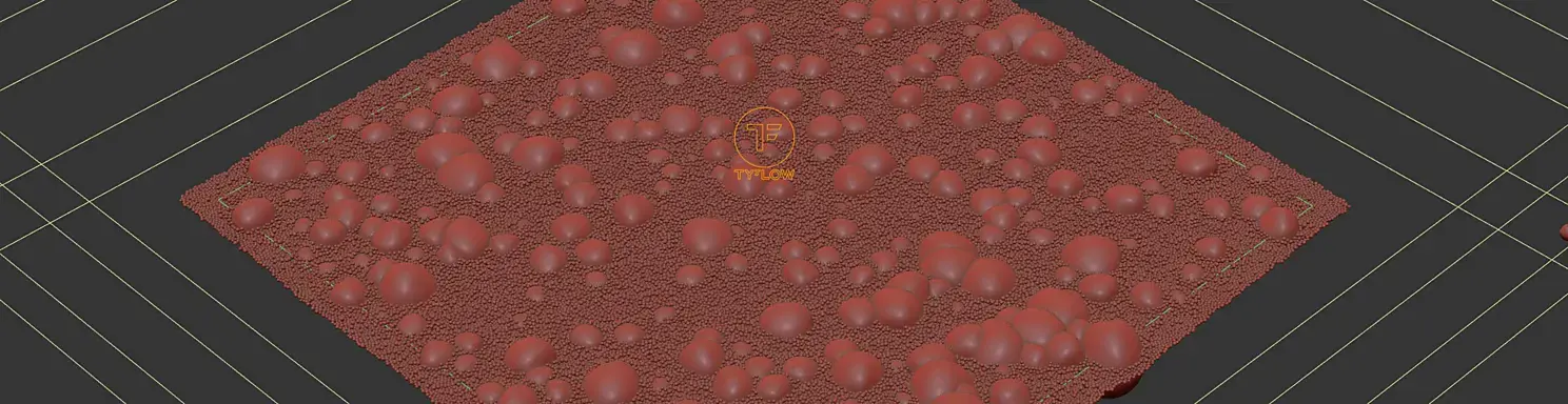 То для получения текстуры капель уже пришлось подрубать tyflow. Логика тут такая: на плоскости рождается кучка мелких капель, потом несколько больших начинают двигаться по извилистой траектории вниз, "собирая" собой эти капли, попутно оставляя хвост из мелких капель. Не самая удачная реализация...