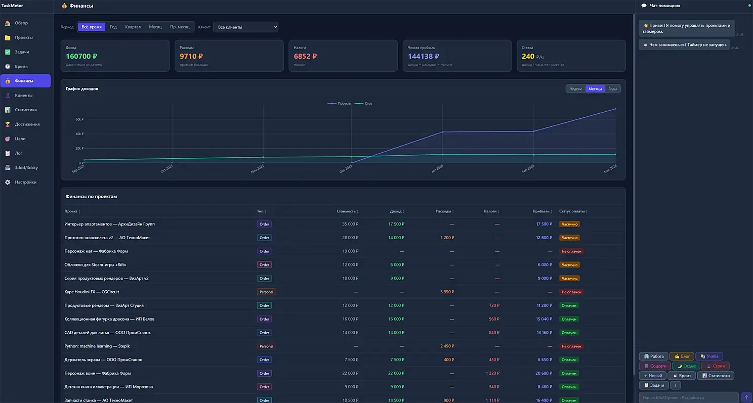 Несколько месяцев назад я поймал себя на том, что понятия не имею, сколько часов реально уходит на разные проекты. Заказ закрыт, деньги получены — а прибыльным ли он был? Непонятно. Сколько потрачено на модель для стока, которая продаётся раз в квартал? Тоже непонятно. Готовые трекеры времени я пробовал — что-то не то. Либо слишком сложно, либо облако, либо не под мои задачи. И я пошёл по кривой дороге — писать своё.