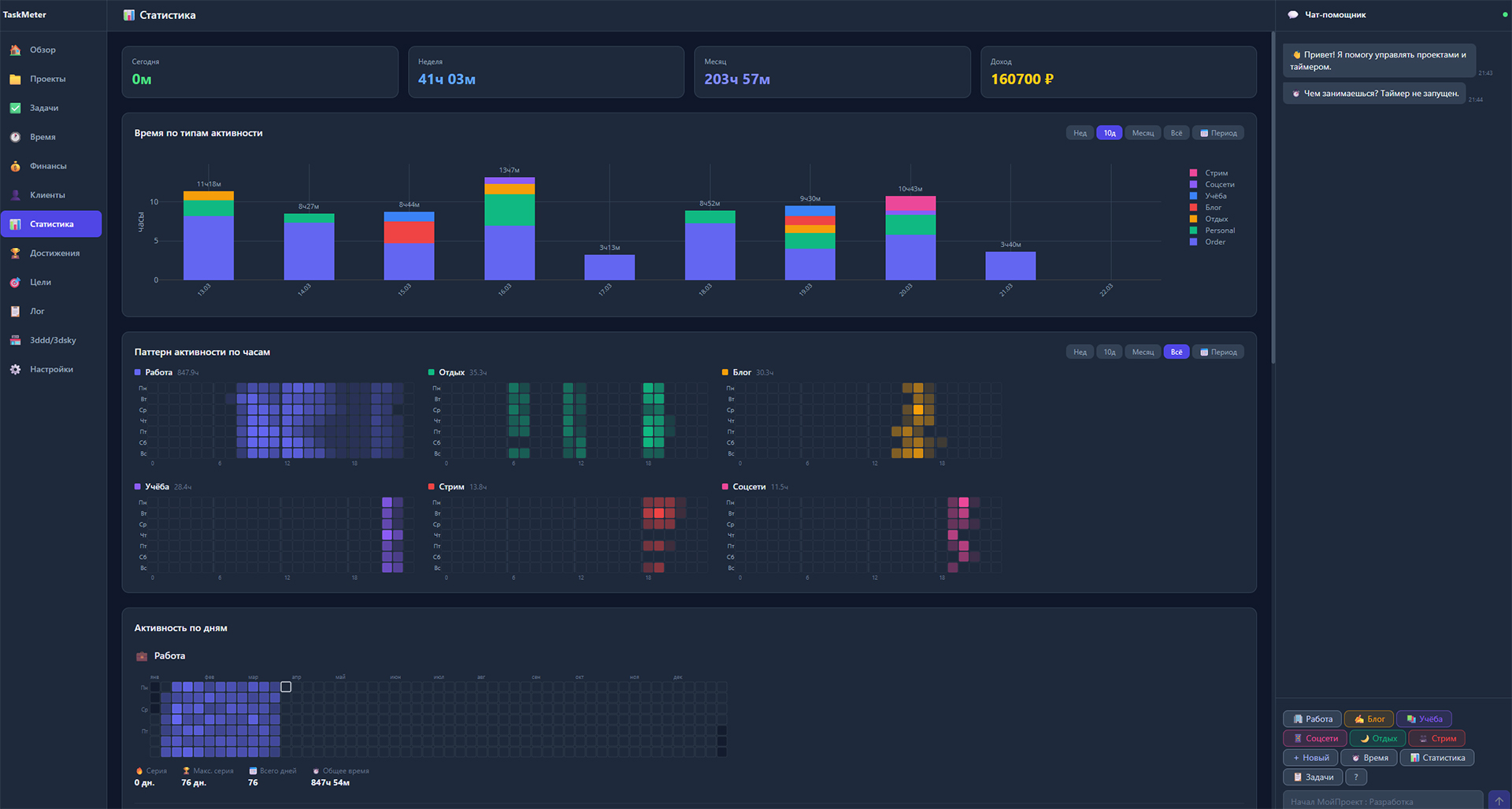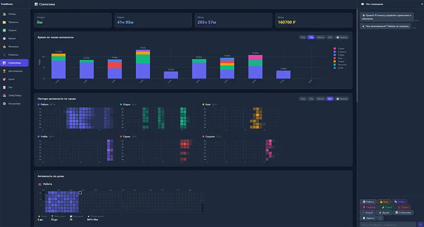 Сначала был Telegram-бот. Простой: написал «начал работу», бот засёк время. Написал «закончил» — записал сессию. Потом адаптировал его под MAX мессенджер. Потом захотелось видеть не просто цифры в чате, а нормальную картину — графики, динамику, сравнения. Сделал отдельный дашборд: таблицы, хитмап активности, статистика по типам работы. Заодно прикрутил GigaChat — он анализировал данные и давал советы прямо внутри интерфейса. Это уже было что-то рабочее. Но со временем стало понятно: нужна единая система, где всё вместе — и трекер, и задачи, и финансы, и сток. Так появился TaskMeter.