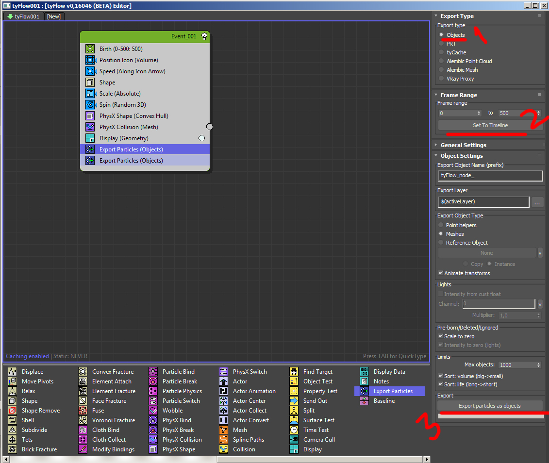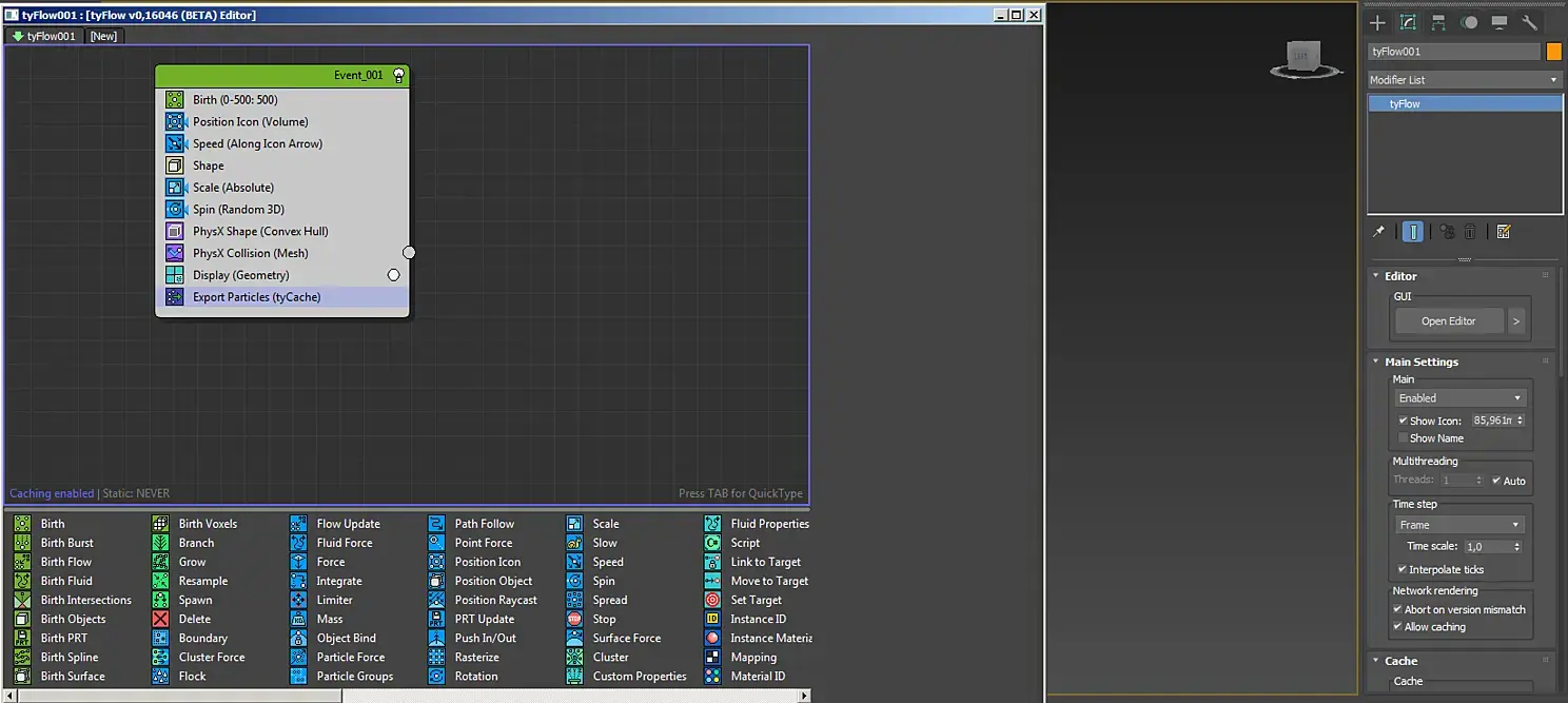 После выбираем наш tyflow и открываем editor и перед нами открывается нодовое окно настройки частиц. Выбираем нужные: