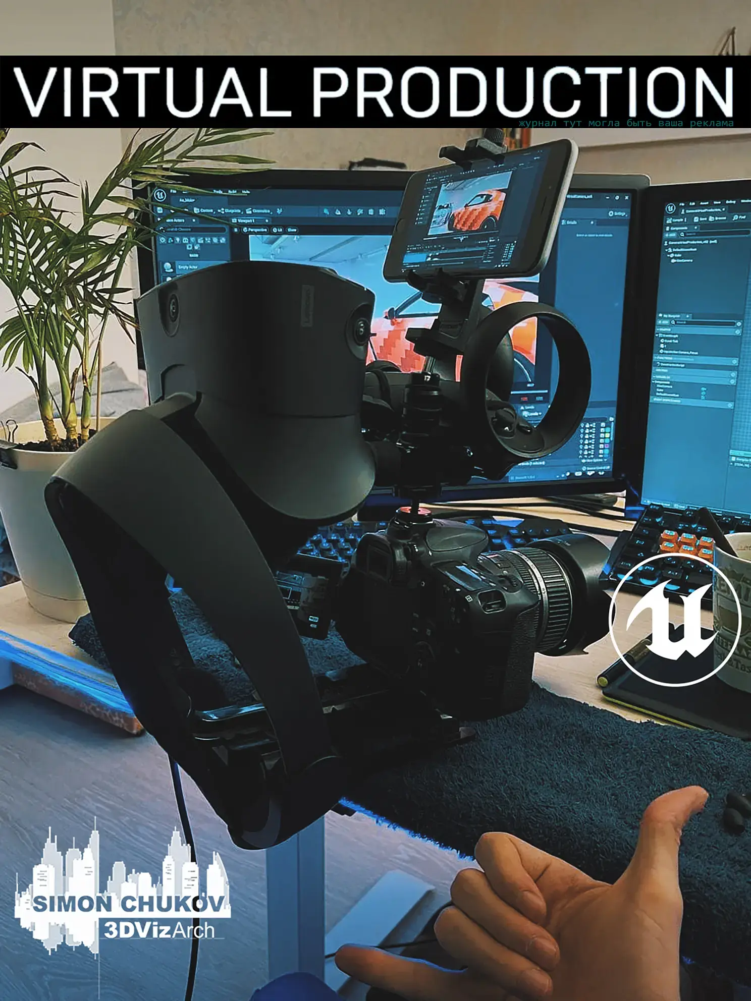 Таким образом, работа компьютерного художника превращается в развлечение с поиском новых применений и решений с последующим описанием результата в виде туториала или хотя бы небольшой статье вроде этой. Для заказчика это возможность доступным образом, в короткие сроки получить новый контент построенный на современных технологиях, за доступные деньги в отличии от много миллионного бюджета оборудования для большого кино.В этой статейке я коротко описываю свой риг с ссылками на оригинальные уроки что бы не искажать первоисточники. И так! Для того что бы собрать качественную виртуальную студию можно использовать разные решения, их правда очень много на сегоднешний день. Я хочу показать на примере доступного шлема виртуальной реальности Oculus Rift S. Для того что бы подключить шлем к анрилу и вообще, понять как это работает, желательно иметь базовые познания UE5 хотя бы для болимение свободной ориентации в интерфейсе. В этих уроках вы узнаете как создать текстуру с видеопотоком: 1) youtube 2) youtube Тут короткий урок как подключить VR контроллер:youtube (видео-уроки на английском но с помощью яндекс браузера можно послушать и на русском. У яндекса сейчас работает отличная нейронка которая в реальном времени переводит на родной).В принципе это все!=)Камера РигНа самом деле для переноса данных положения камеры в ц цифровое пространство нужен только один контроллер практически от любого набора виртуальной реальности. Я испытал эту технологию с помощью шлема Oculus Rift S, дешевый держатель камеры на который добавил мобильный телефон. Для передачи изображения изнутри трехмерной сцены прямо на риг с камерой. Где бы я не находился в дали от компьютера, я вижу то что видет камера в трехмерной сцене. Для этого я взял свой старенький айфон и просто позвонил на него через AnyDeskИзюминка на торте это физическая камера с которой я планирую транслировать видео из реального мира в Unreal Engine 5После череды тестов я попробовал добавить к ригу сам vr шлем. С учетом того что для работы oculus rift используются камеры на самом шлеме без необходимости в установке дополнительных станций отслеживания шлема в пространстве как например у HTC Vive. Мы не ограничивается дистанцией радиуса действия этих доп станций. При хорошем раскладе можно вооружится хорошим ноутбуком с проектом на борту, подключить этот риг и пойти на улицу писать анимацию виртуальной камеры на любом расстоянии перенося ноутбук с ригом на семе. В результате трехдневного марафона по поиску решения "Виртуальный проданшин на дому", у меня получился довольно серьезный первый риг как у настоящих кинодельцев:)Далее планирую програмно улучить систему с помощью блюпринтов UE5. Первым делом хочу задействовать кнопки на контроллере для управления фокусным расстоянием, зумом, экспозиции, дополнительной программной стабилизации цифровой камеры. За тем провести полноценные тесты в боевых условиях создать какой то проект с применением данной технологии. За тем куплю зеленые паруса (огромный кусок зеленой ткани для хромакея) и проведу новые тесты с последующим описанием процесса создания качественного Virtual Production в домашних и не очень условиях.Ну а какой проект видите Вы? И вообще, какие есть идеи в применении данной технологии, в ближайшем будущем? Прошу в комментарии как к данному посту так и в социальных сетях где я активно 