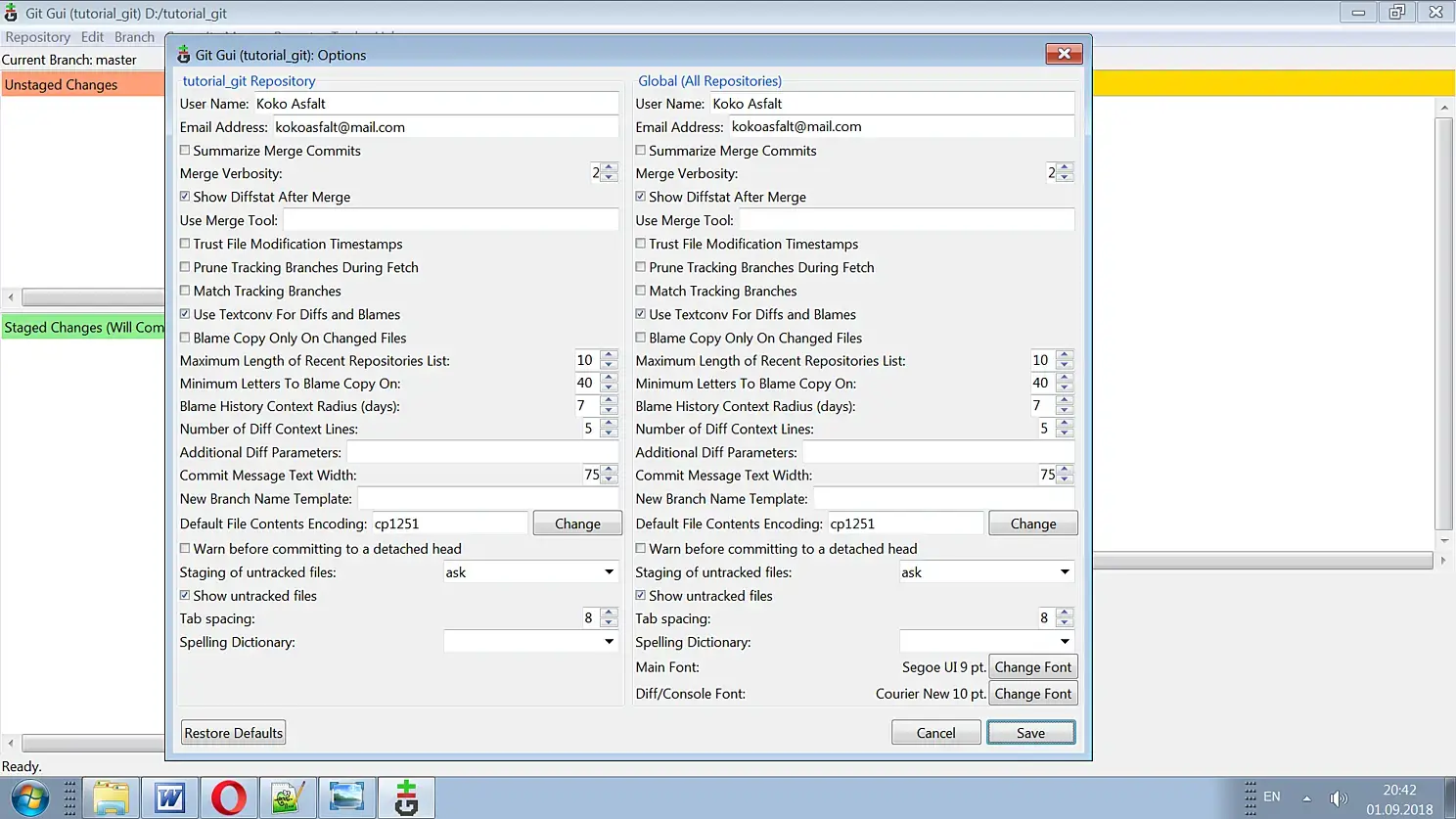 Нужно сделать пару настроек после первого запуска программы. В «Edit – Options» найти по два поля «User Name» и «Email Address». Это глобальные и локальные имя пользователя и почтовый адрес. Можно ввести любую правдоподобную информацию, т.к. в настоящий момент для нас это лишь внутренняя настройка, формально нужная для обозначения инициатора при внесении изменений в системе. Жать «Save».